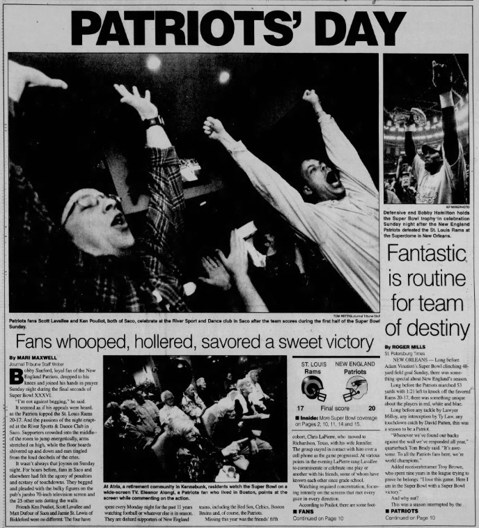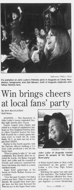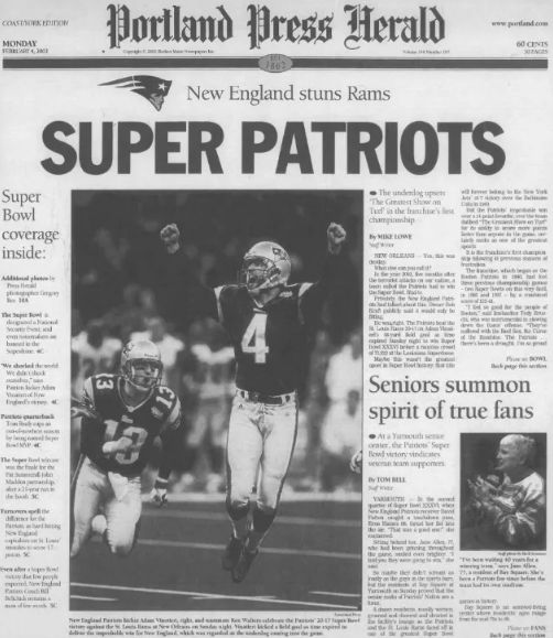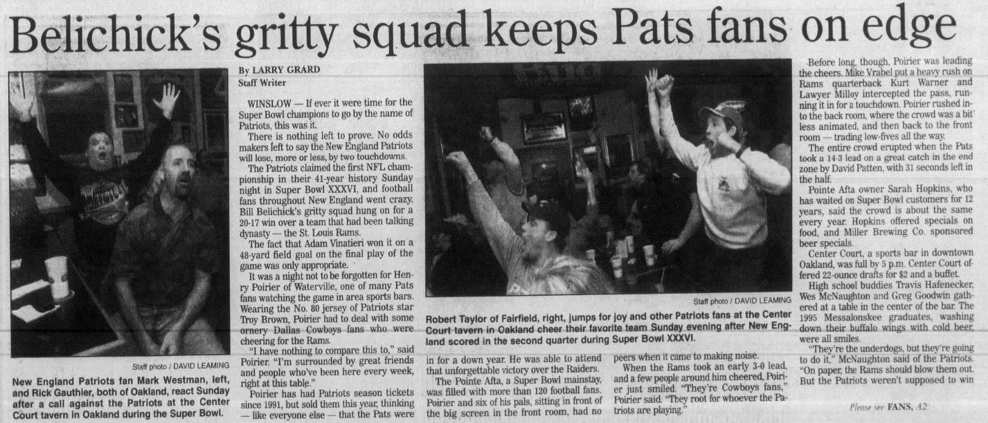 “The basement in John Loiko’s house exploded Sunday night shortly after 10 p.m.,” the Kennebec Journal’s Dan McGillvray reported. “Guests leaped from chairs and yelled in a round of celebratory harmony as New England Patriots kicker Adam Vinatieri booted the football 48 yards for a clutch game winning score to crush the St. Louis Rams, 20-17, as time ran out in Superbowl XXXVI.”