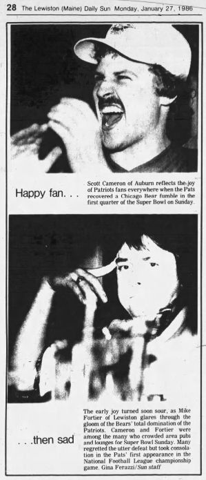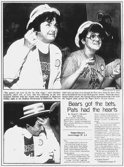 Charlotte Gaudette of Saco, at left, and Cora Bouchard of Biddeford cheer on the Patriots, only to wind up disappointed. From the Journal Tribune, Jan. 27, 1986. (Courtesy of Newspapers.com)