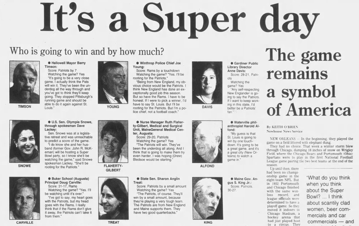 There was more optimism in Patriots Nation this time around. In a “who’s who” poll of Mainers, including then-Gov. Angus King and Waterville philanthropist Harold Alfond, six people predicted the Pats would claim the Lombardi trophy, and three leaned toward the Rams.