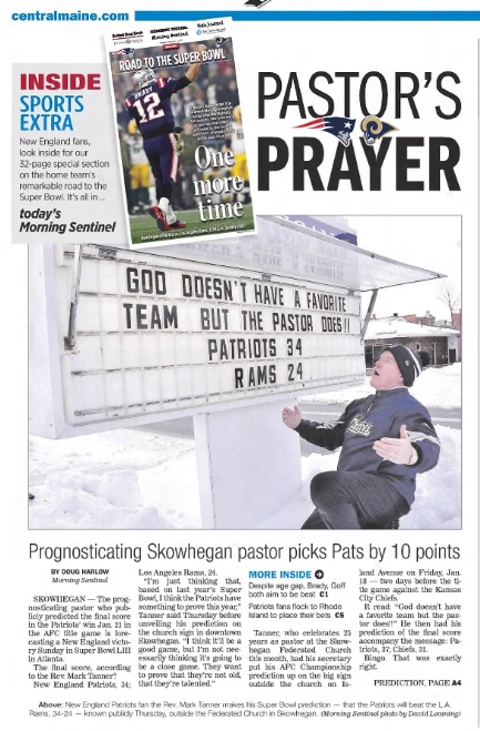 Elsewhere, a sign outside the Federated Church in Skowhegan stated that “God doesn’t have a favorite team but the pastor does!!” The Rev. Mark Tanner, who’d successfully called the Pats’ final score in the Jan. 21 AFC championship game, predicted the Pats would win, 34-24.