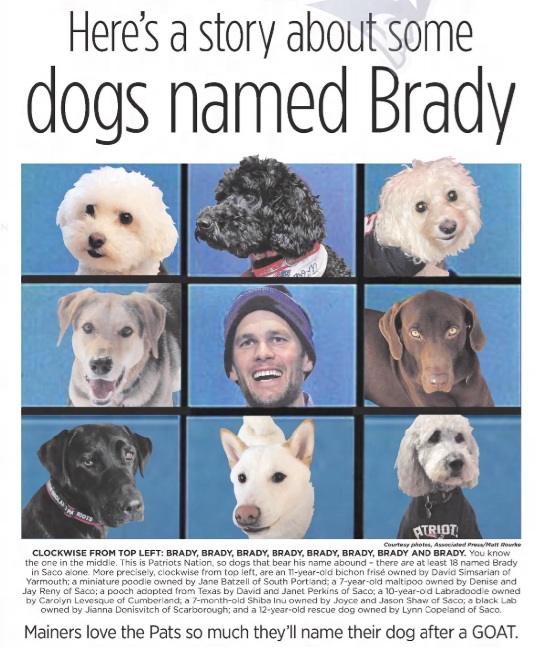 “Here’s a story about some dogs named Brady” sang a headline in the Feb. 3, 2019, Portland Press Herald. Gillian Graham reported that Saco alone had 18 dogs named after Tom Brady. Lynn Copeland said she’d named her puppy as such because he was “handsome and tall and strong. He was a really good guy. The only person we could think of like that was Tom Brady.”