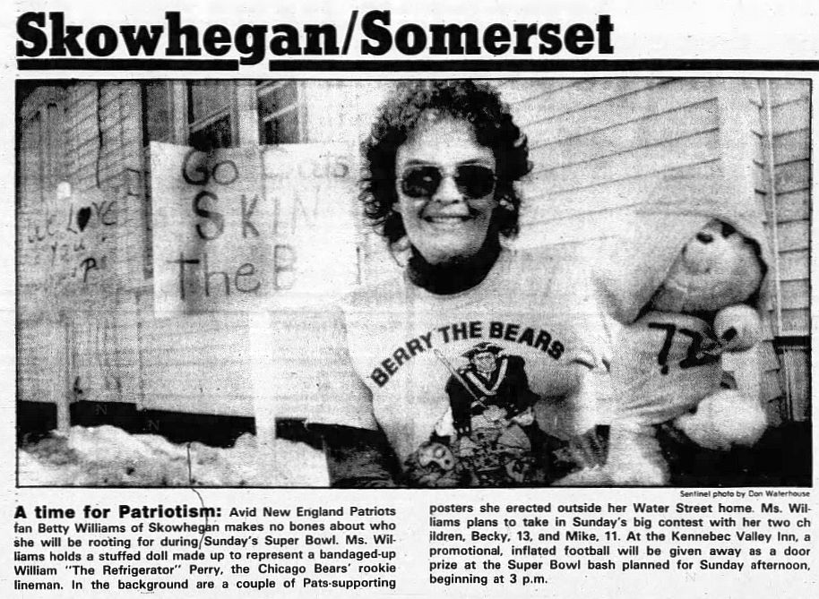 Posing for a Morning Sentinel photographer in the days leading up to the 20th Super Bowl outside her Skowhegan home, Betty Williams sported a shirt depicting the classic “Pat Patriot” logo, with a twist — Pat had hands on a shovel instead of a football, with the words “Berry the Bears” above him.