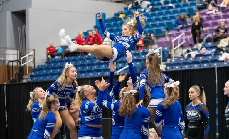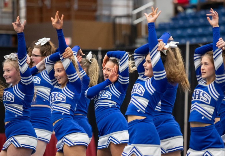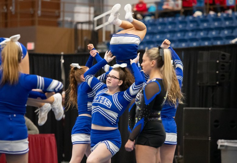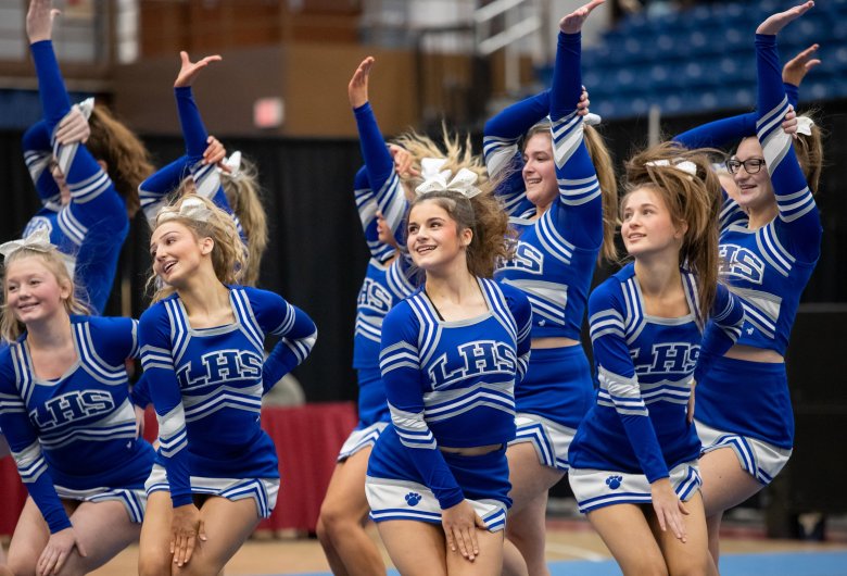 The Lawrence High cheering team was on the mat Saturday morning at the Augusta Civic Center, ready for its three minutes in the Class B state championship.