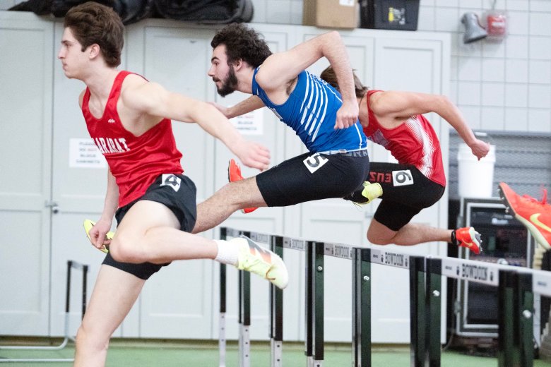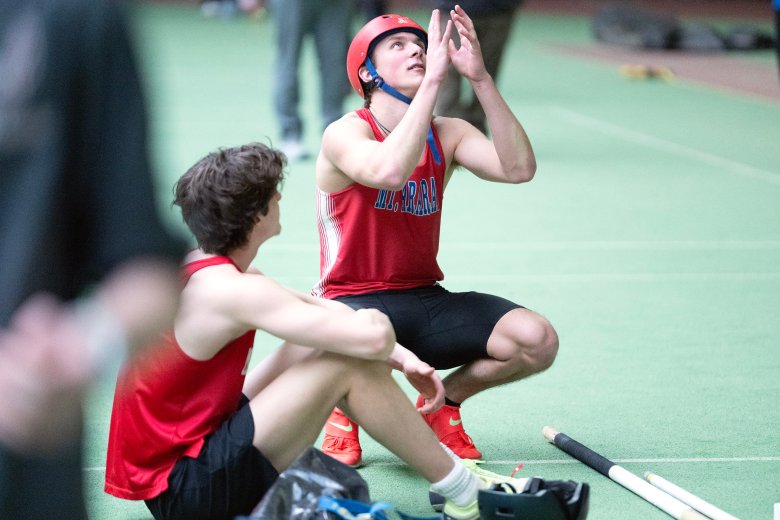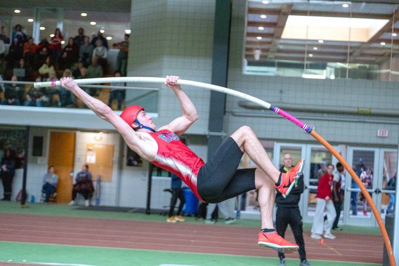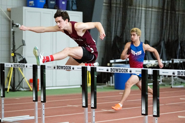 Edward Little junior Thomas LeBlanc won the 55-meter hurdles (8.01) and the pole vault (14-6, first attempt), beating Mt. Ararat senior Bryce Holden by 0.01 seconds and one fewer attempt.