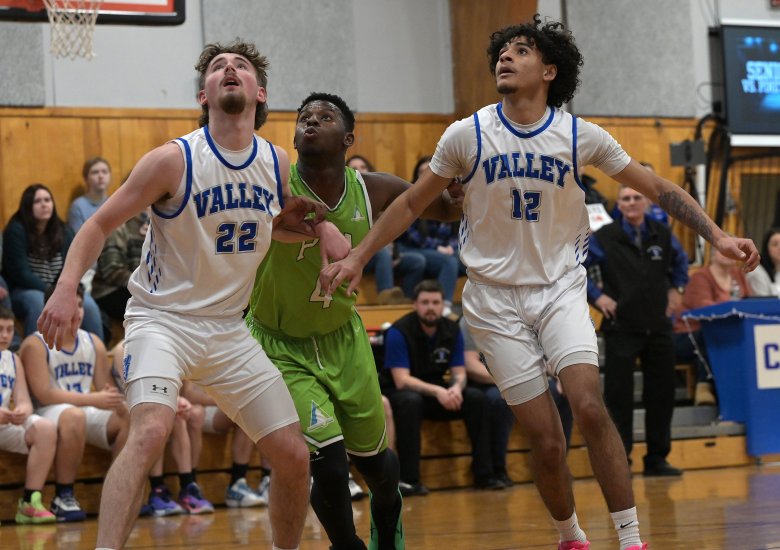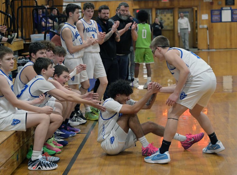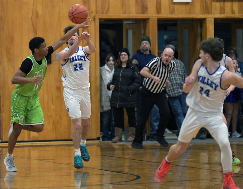 With the Valley boys up 30 in the fourth quarter of a Senior Night game last Tuesday against Pine Tree Academy, seniors Harry Louis and Fisher Tewksbury were subbed out of the game. Fans gave a lasting ovation to the two seniors, who shared long hugs with coach Mike Staples and assistants Daron and Dillon Beane.