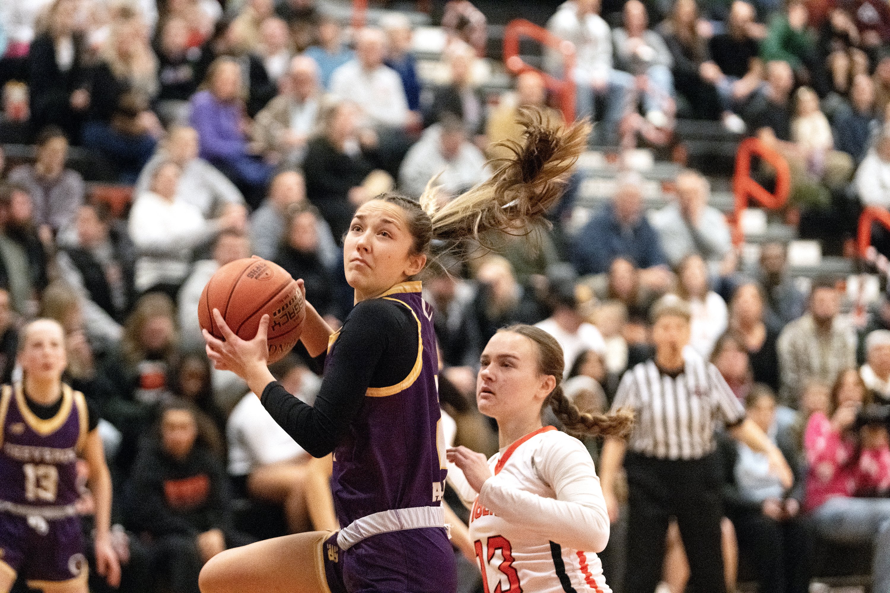 Biddeford’s Jordyn Crump goes up for a shot against Thornton Academy during a game in December. (Brianna Soukup/Staff Photographer)