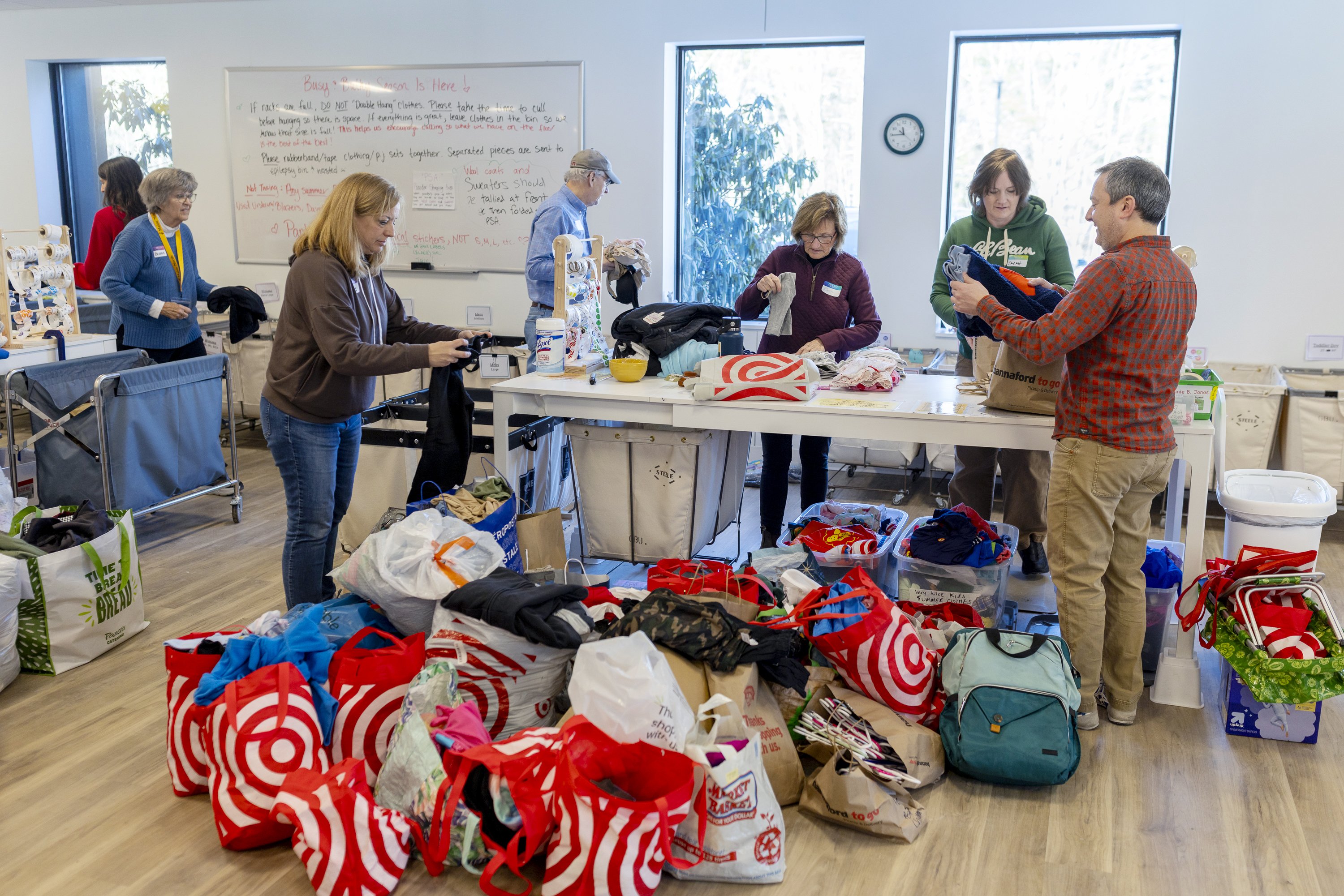 Volunteers sort through donated goods at Maine Needs headquarters in Portland on Friday. (Brianna Soukup/Staff Photographer)