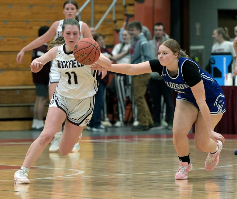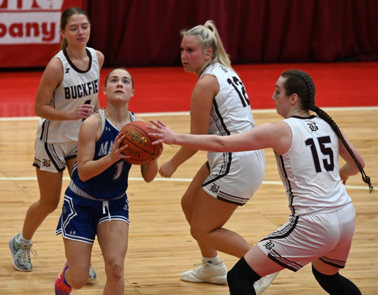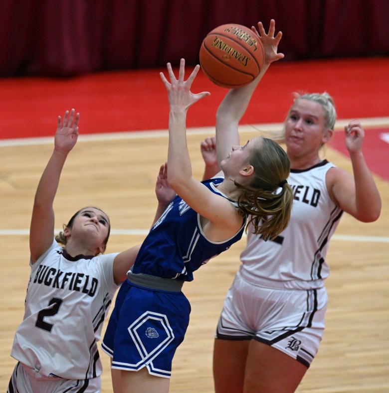 Buckfield never trailed, holding Madison without a basket until early in the second quarter. The Bulldogs struggled to make shots all morning, shooting 6% from the field in the first half and 12% for the game. The Bucks won the rebounding battle, 41-27, and capitalized often by pushing the ball up court with an overhand pass to senior Chloee Bennett (11 points) or freshman Haleigh Campbell (10 points).