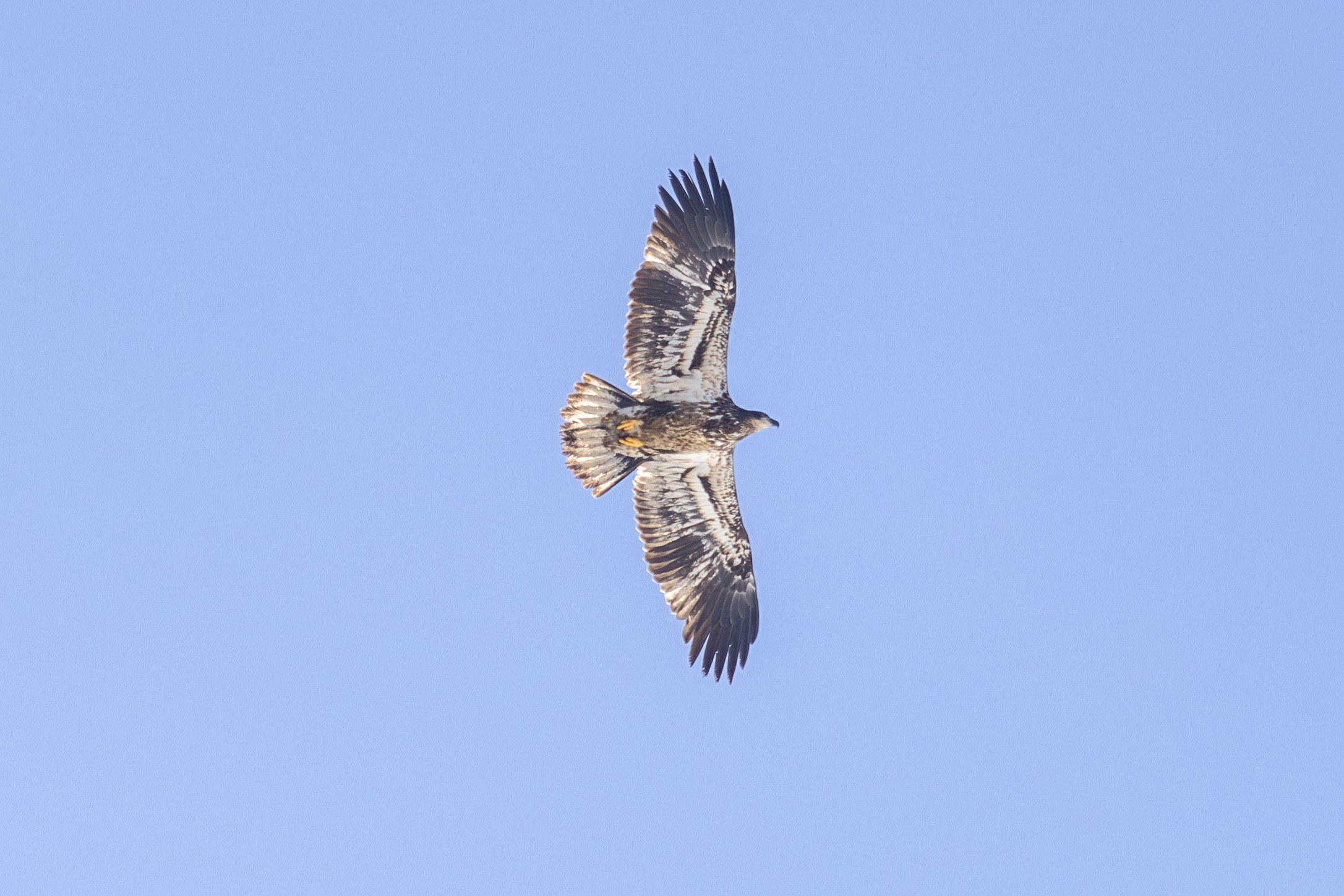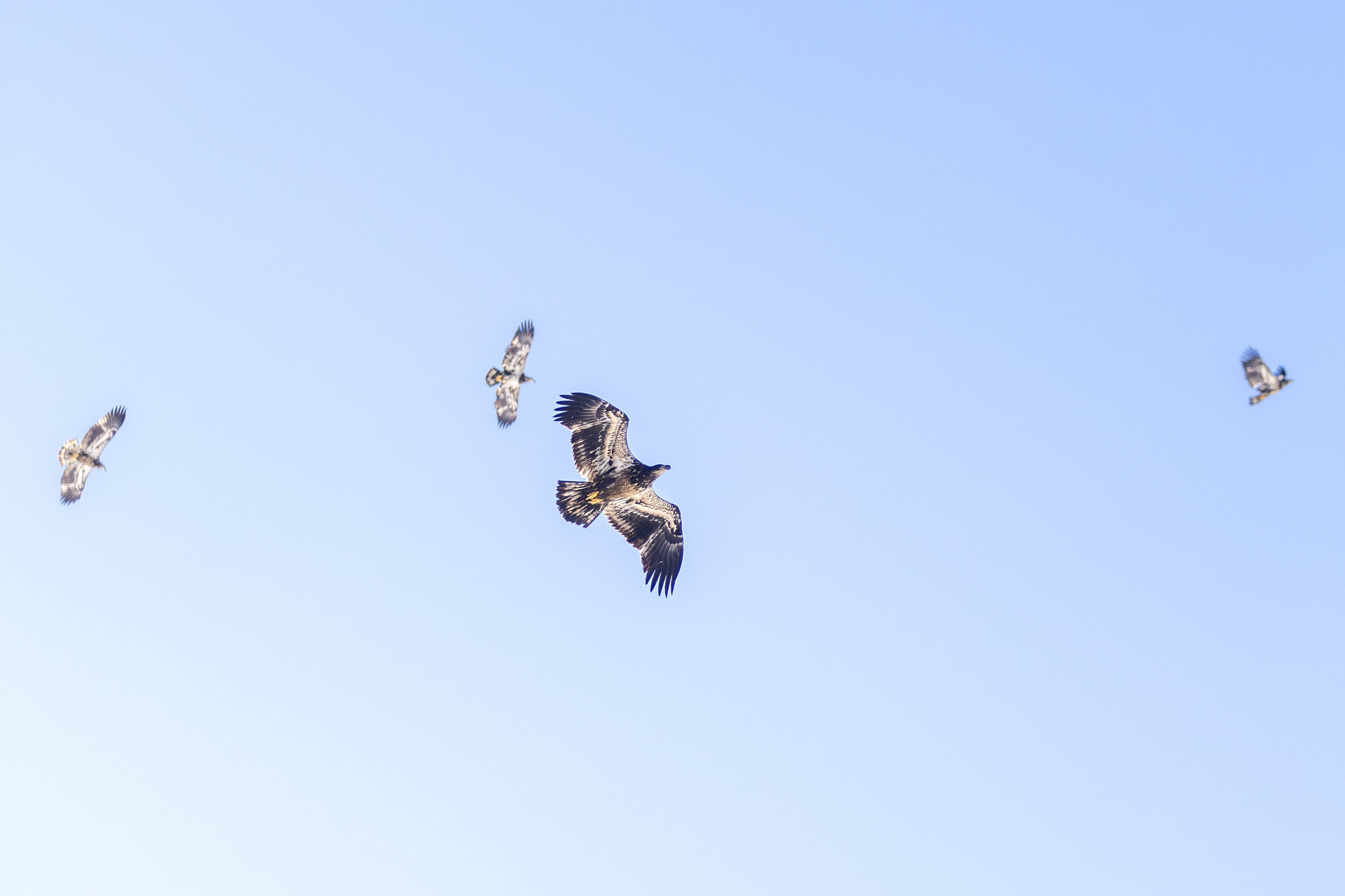 An immature bald eagle flies Thursday above the Kennebec River in Randolph. According to Avian Report, an eagle’s immature status lasts four to five years.An immature bald eagle stretches its wings as it flies across a blue sky Thursday near the Kennebec River in Randolph.A soar of immature bald eagles circle above the Kennebec River on Thursday in Randolph. Eagles are typically seen in groups when a large food source has drawn them to a location.