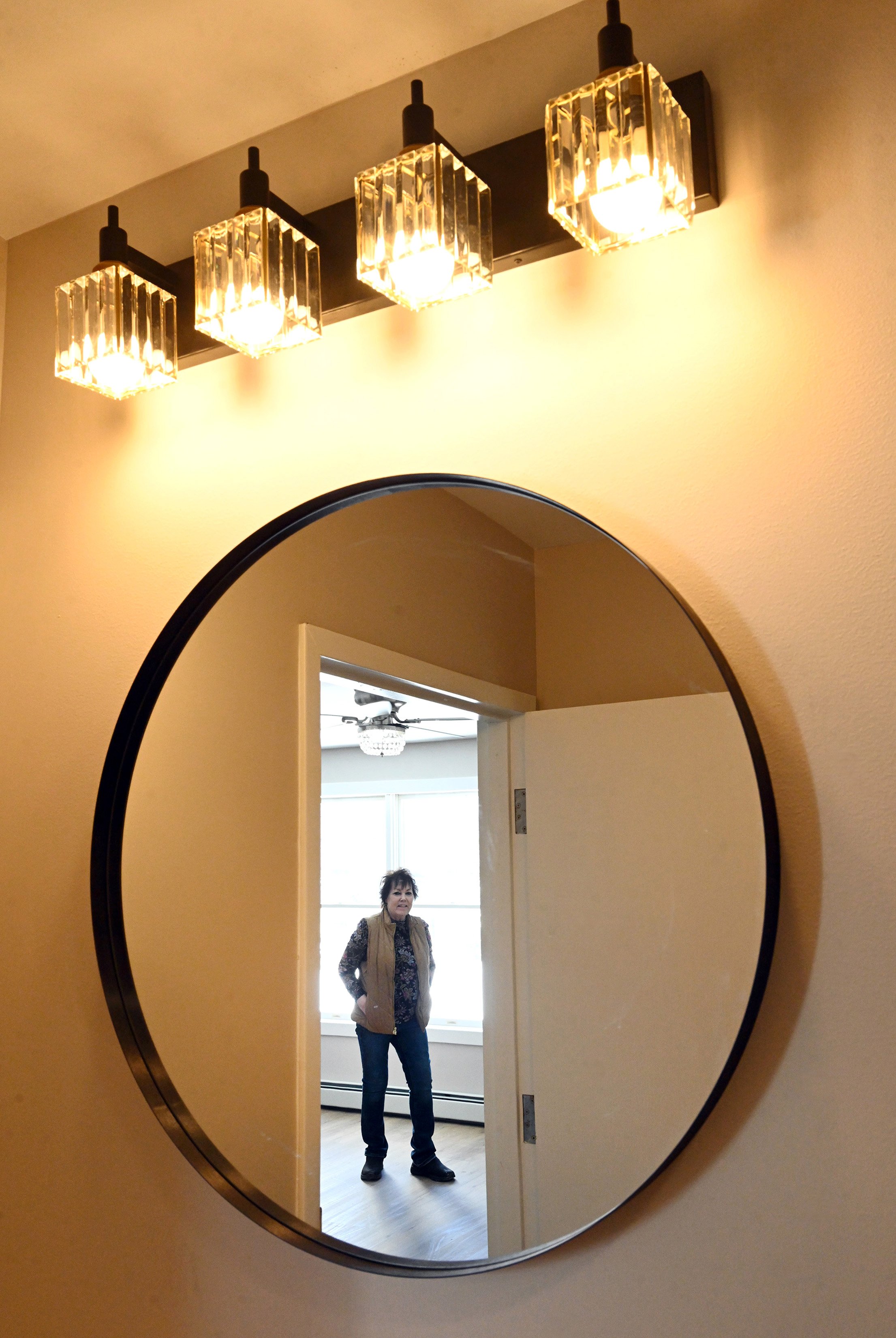 Lori Noonan, co-owner and designer at the Capital City Heights Apartments, leads a tour for the media Friday during a soft opening of the apartments in Augusta. (Rich Abrahamson/Staff Photographer)
