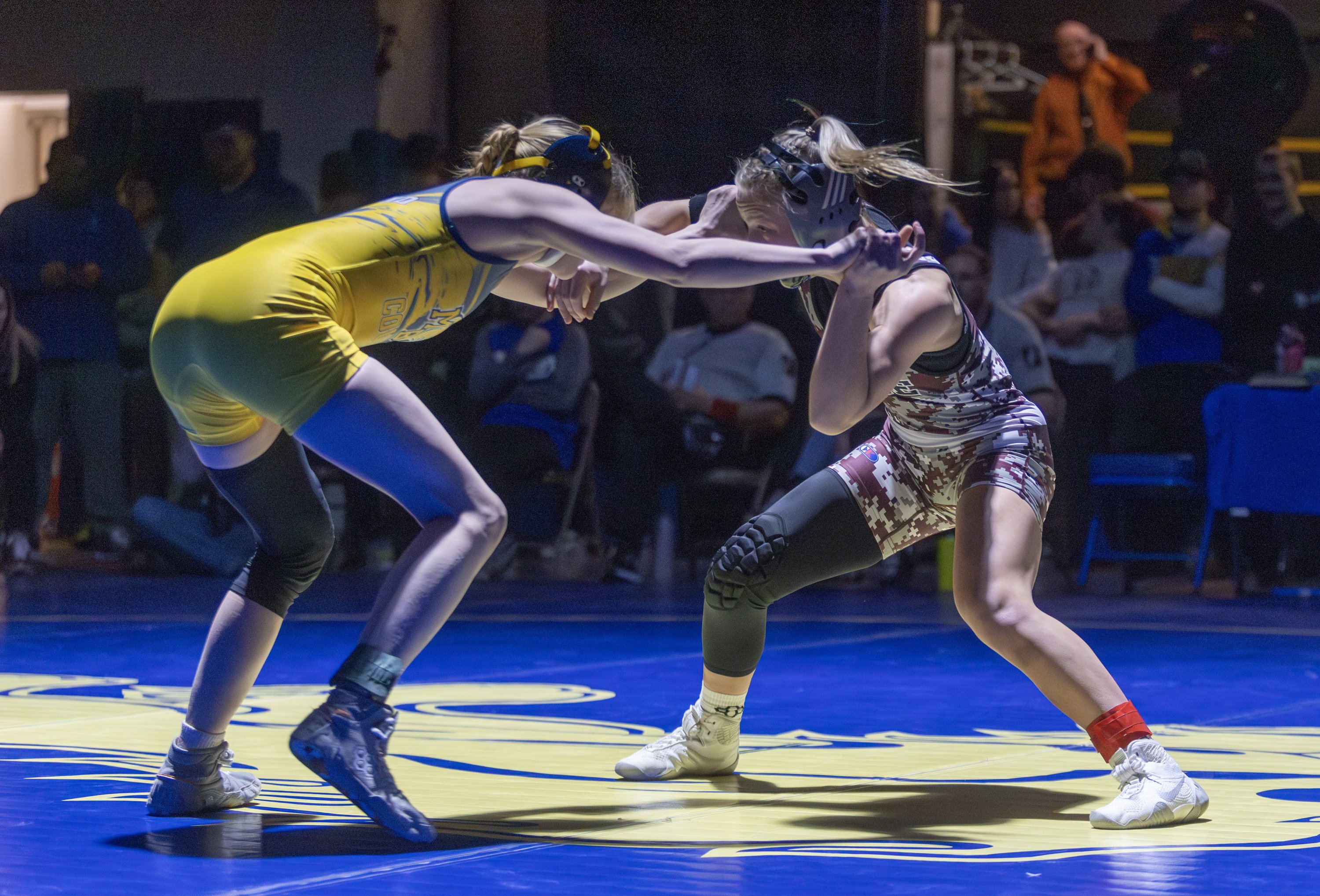 Noble’s Hannah Perro, right, and Mt. Blue’s Abigail Garland battle in the 100-pound final Tuesday at the girls wrestling state championship in Belfast. (Anna Chadwick/Staff Photographer)