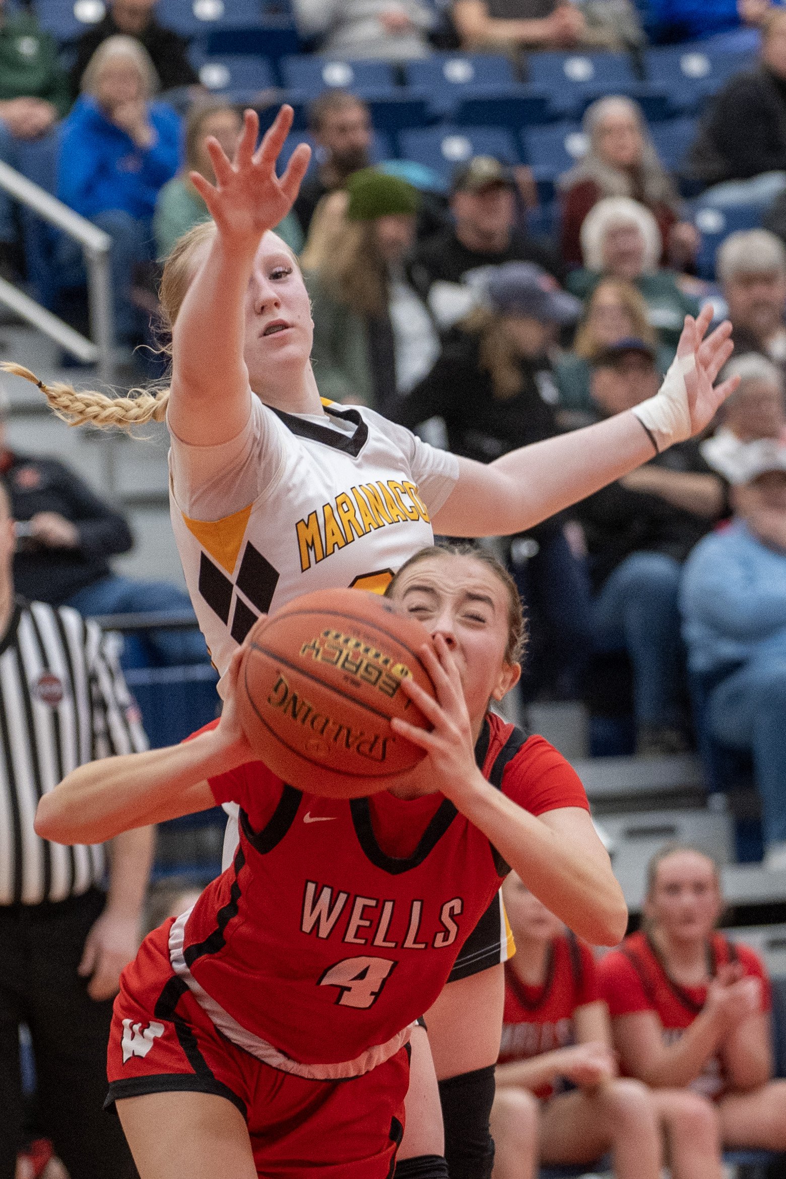 Maranacook’s Jackie Clark, top, defends against Wells’ Eva Talevi during a Class C South semifinal basketball game Thursday in the Hammond Lumber Auditorium of the Augusta Civc Center in Augusta. (Joe Phelan/Staff Photographer)