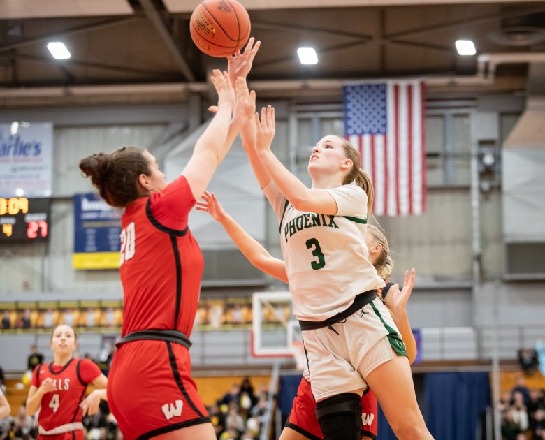 Junior forward Maddie Grimaldi led the Phoenix with 21 points and nine rebounds. Sophomore guard Lily Bellerose added 12 points and five rebounds, and junior guard Natasha McDonald scored 10 points.