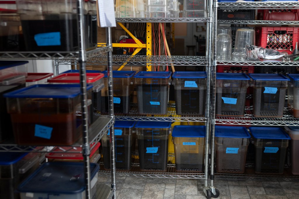 Bitters from Vena’s Fizz House in Westbrook are similarly “purpose-built,” according to co-owner Dan Cisowski. Shelves in Vena’s bitters worskhop are loaded up with about 90 tinctures — infusions of individual bittering agents and flavoring ingredients — which they combine in precise quantities to produce their line of 16 cocktail bitters.