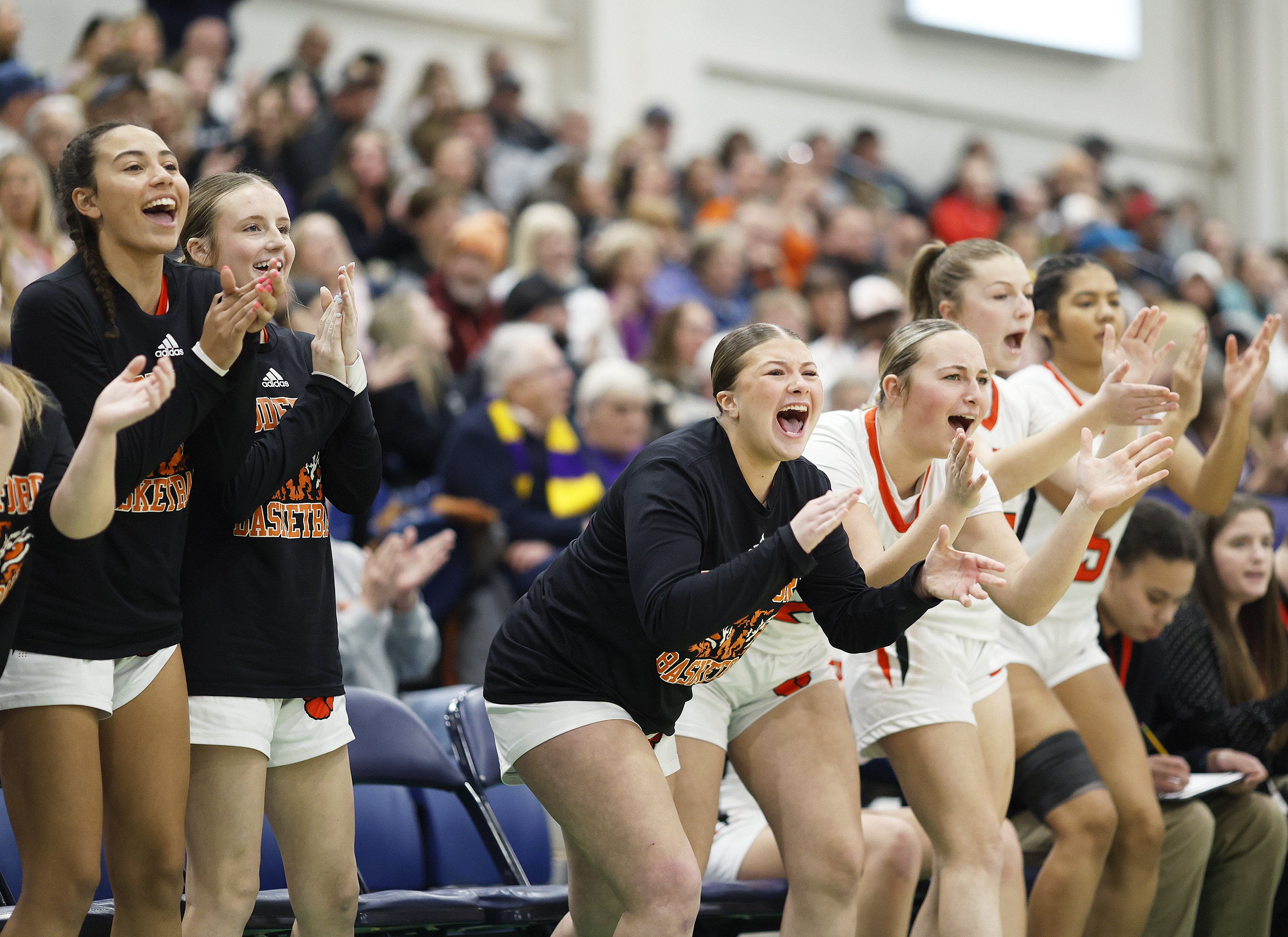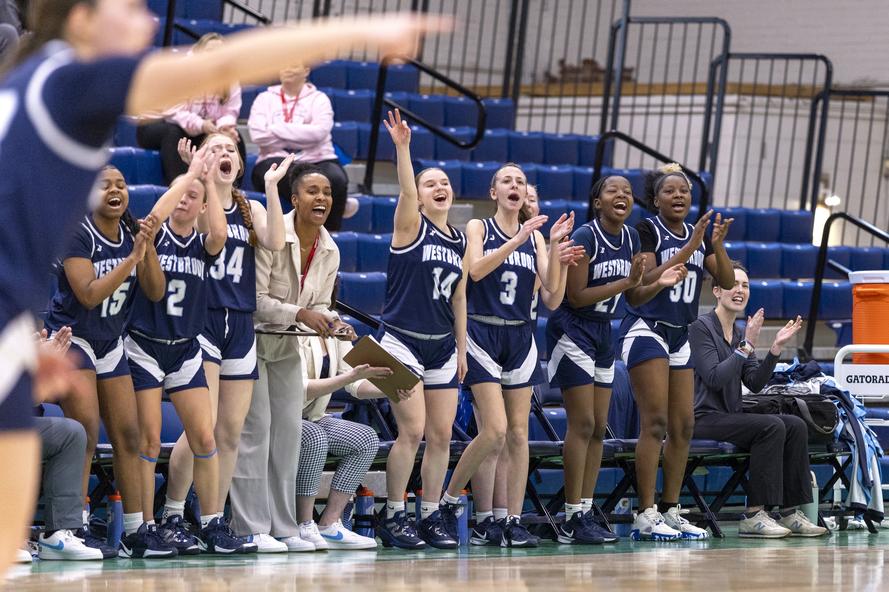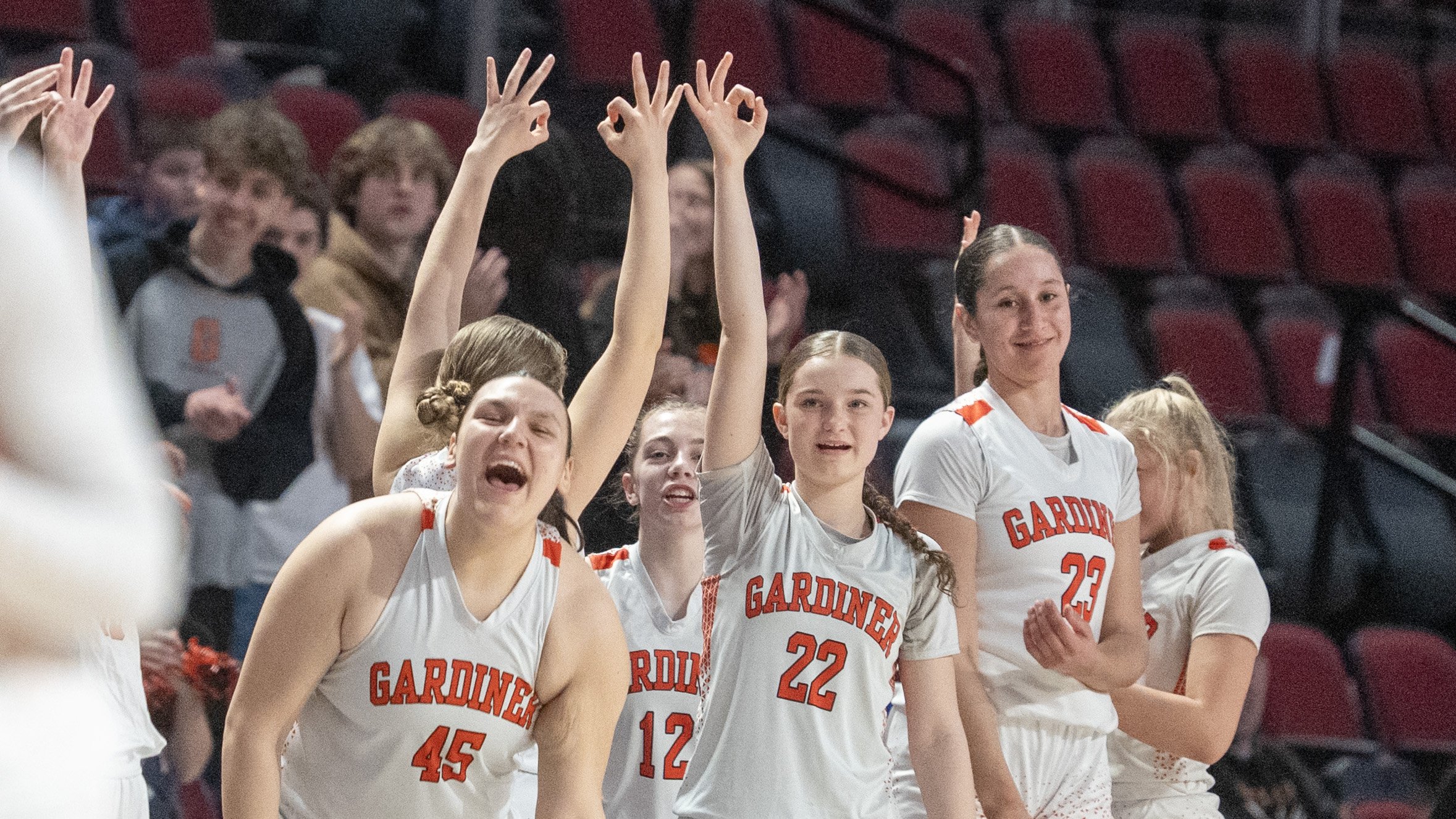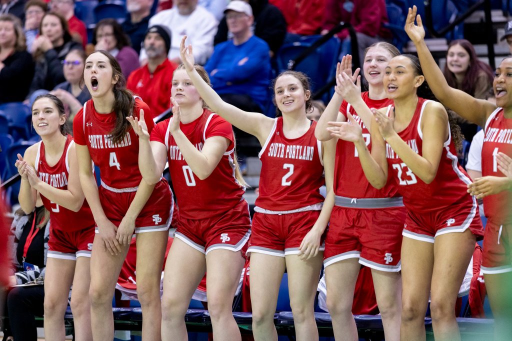 Oak Hill coach Chuck Cullins instructs his team during its Class C South quarterfinal against Winthrop on Tuesday at the Augusta Civic Center. Winthrop won, 41-39. (Russ Dillingham/Staff Photographer)Brunswick coach Ben Clark, right, and players react after a basket put the game out of reach for Edward Little during a Class A North semifinal game Wednesday at the Augusta Civic Center. (Russ Dillingham/Staff Photographer)Oceanside players do a dance on the bench after a teammate sank a 3-point basket against during their 52-37 win over York in a Class B South semifinal on Wednesday at the Portland Expo. (Derek Davis/Staff Photographer)Cheverus coach Richie Ashley coaches on the sideline during his team’s 61-60 win over Thornton Academy during a Class A South quarterfinal on Saturday at the Portland Expo. (Brianna Soukup/Staff Photographer)Hampden Academy’s bench celebrates after a made 3-pointer during a Class A North semifinal on Wednesday at the Augusta Civic Center. The Broncos won, 41-39, to advance to the regional final. Libby Kamrowski Kenny/Staff Photographer)Valley girls basketball players celebrate a basket late in fourth quarter of the Class S South final Saturday at the Augusta Civc Center. (Joe Phelan/Staff Photographer)Players on the Lawrence bench erupt after Maddy Provost scored a basket during the Bulldogs’ 47-42 win over Ellsworth in a Class B North semifinal on Wednesday at Cross Insurance Center in Bangor. (Joe Phelan/Staff Photographer)Brunswick teammates celebrate after Bryce Gerrish hit a 3-pointer during the Dragons’ 66-37 win over Mt. Blue in a Class A North quarterfinal on Saturday in Augusta. (Derek Davis/Staff Photographer)The Winthrop bench erupts as referee Rob Lemar, right, signals a 3-pointer on a shot by Cyara Harriman, foreground, during the Ramblers’ come-from-behind 41-39 win over Oak Hill in a Class C South quarterfinal on Tuesday in Augusta. (Russ Dillingham/Staff Photographer)South Portland players watch from the bench in the final minutes of the Red Riots’ 34-33 loss to Portland in Class A South quarterfinal on Saturday at the Portland Expo. (Brianna Soukup/Staff Photographer)South Portland players celebrate a basket during their Class A South semifinal against Sanford Thursday at the Portland Expo. (Brianna Soukup/Staff Photographer)The Scarborough bench reacts to a 3-pointer during their prelim game against Kennebunk. Scarborough won, 50-44. (Shawn Patrick Ouellette/Staff Photographer)Gardiner coach Britney Gero instructs her players during the Tigers’ 46-29 win over Presque Isle in a Class B North semifinal Wednesday at Cross Insurance Arena in Bangor. (Joe Phelan/Staff Photographer)Edward Little’s bench erupts after a 3-pointer by Akol Maiwen, while Ben Augustino smiles during a game against Lewiston on Thursday in Auburn. (Libby Kamrowski Kenny/Staff Photographer)Sanford players celebrate a 3-pointer as coach Rossie Kearson looks on Thursday against visiting Biddeford. (Shawn Patrick Ouellette/Staff Photographer)Gardiner players celebrate after a basket in the first of of the Tigers’ 46-29 win over Presque Isle in a Class B North semifinal on Wednesday at Cross Insurance Arena in Bangor. (Joe Phelan/Staff Photographer)The York bench reacts after Ronin Avery sank a 3-point basket as time expired in regulation to force overtime against Yarmouth on Wednesday in a Class B South semifinal. (Derek Davis/Staff Photographer)Westbrook players celebrate a 3-point shot in the first of a Class A South quarterfinal on Tuesday at the Portland Expo. The Blue Blazes lost to South Portland 43-31. (Brianna Soukup/Staff Photographer)Lawrence coach Greg Chesley gives instructions to his team during its 47-42 win over Ellsworth in a Class B North semifinal on Wednesday at Cross Insurance Center in Bangor. (Joe Phelan/Staff Photographer)Marshwood players and coach Angie Littlefield react to a steal during their Class B South semifinal against Gray-New Gloucester. (Brianna Soukup/Staff Photographer)Biddeford players celebrate after a 3-pointer during their 45-42 win over Windham in a Class A South quarterfinal on Tuesday at the Portland Expo. (Derek Davis/Staff Photographer)