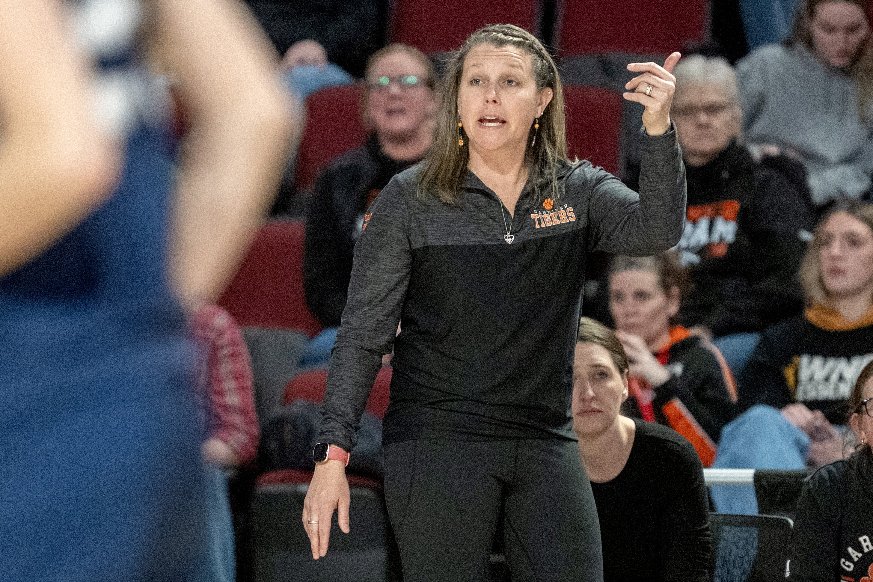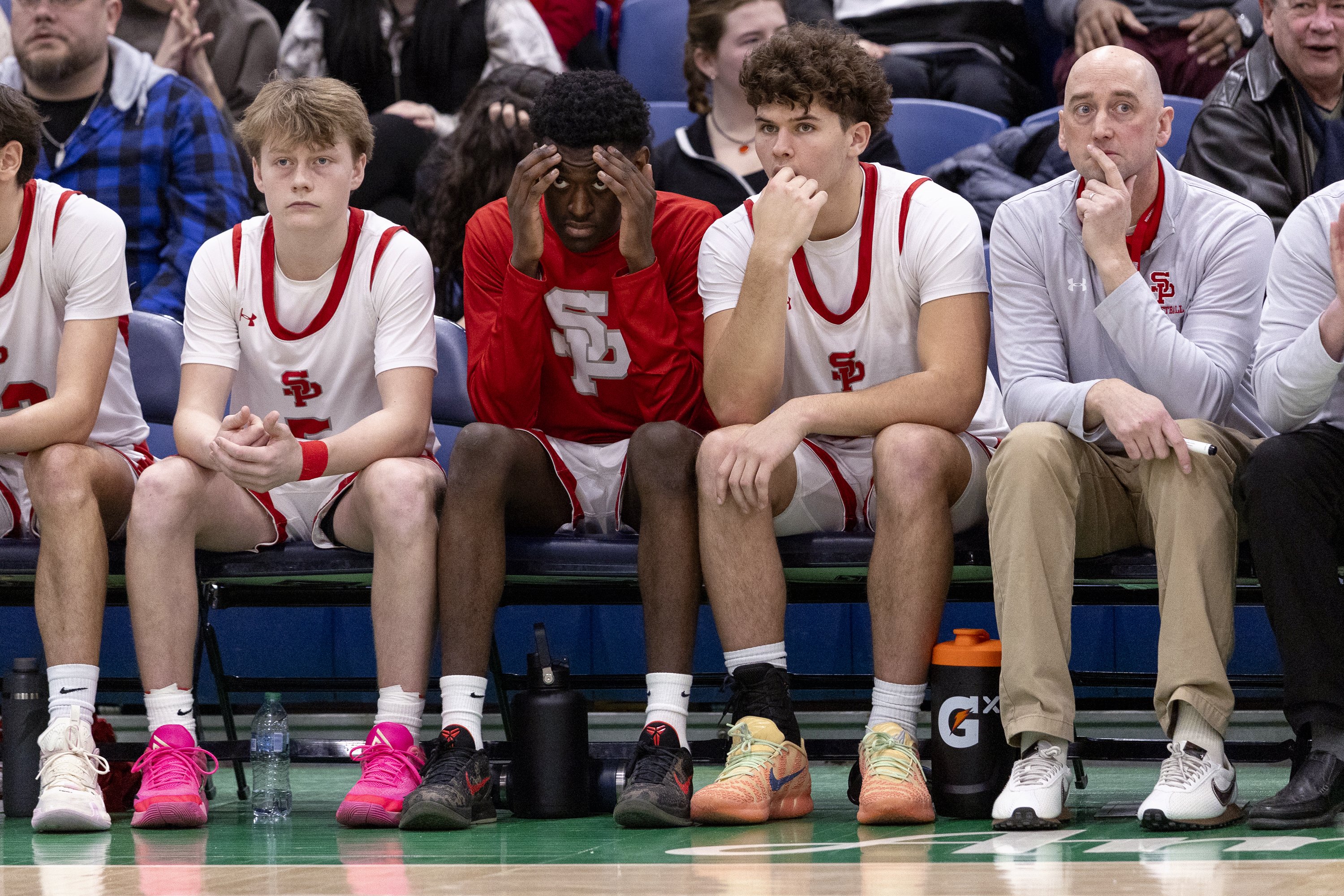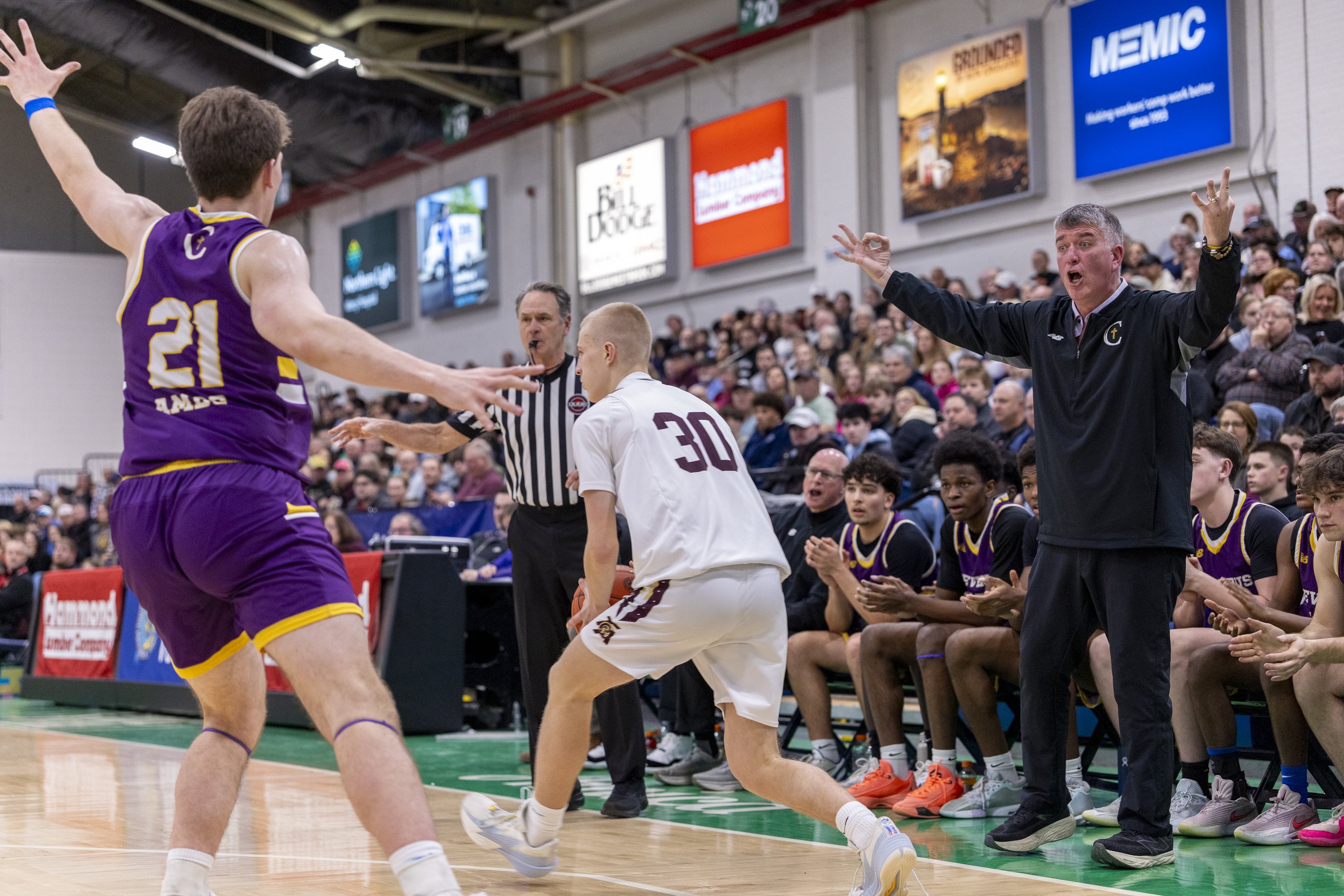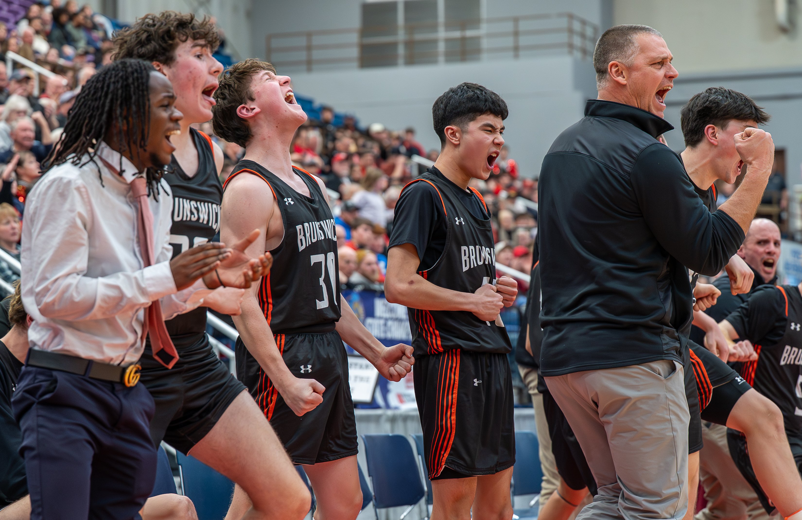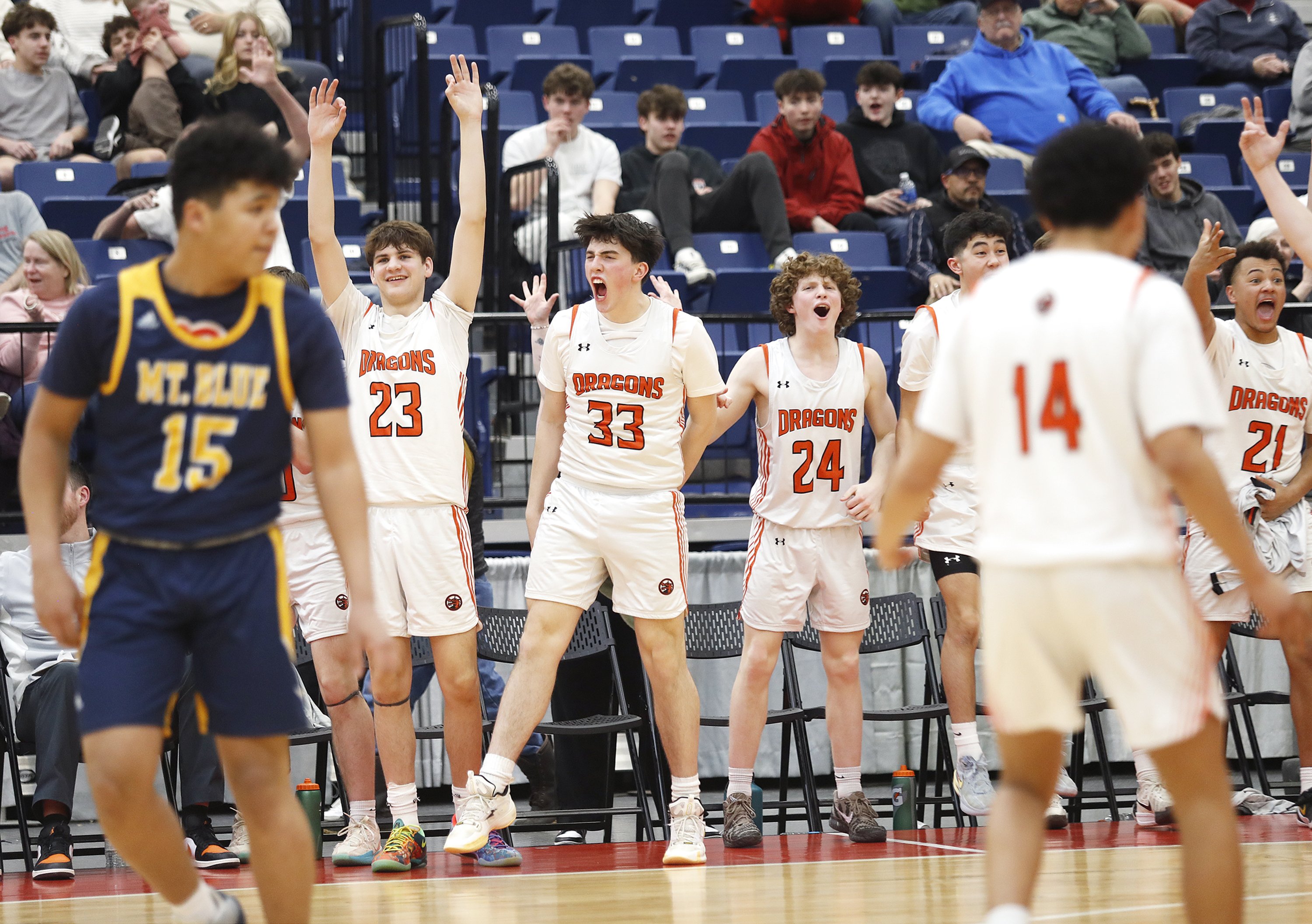 Maine high school basketball sidelines react to tournament action, drama