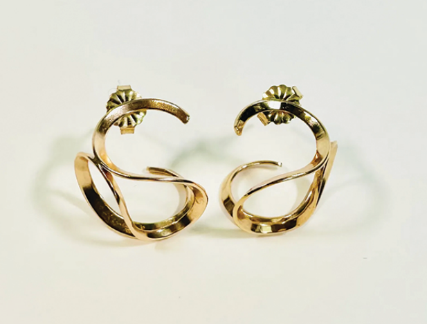 Hand-formed in 18K gold, these curved and swirling earrings catch and reflect light, reminding Daunis-Dunning of the beautiful river that inspired them.
