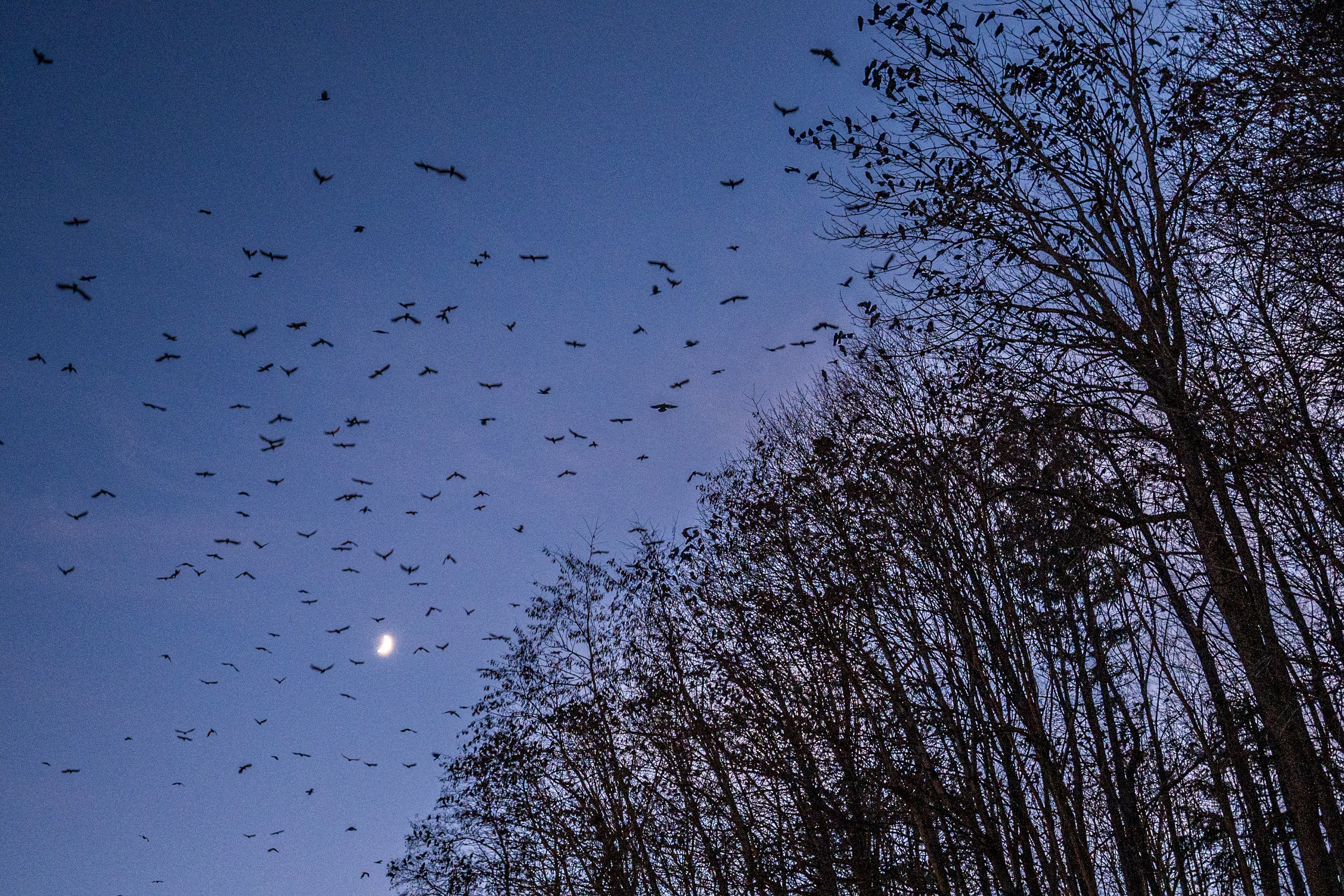 This spectacle occurs in the winter, when crows gather in large murders. After foraging all day in all directions, they come together at dusk to spend the night. Sleeping together helps protect them from frigid temperatures and predators like hawks. And although it has yet to be proven, some documentation also shows that crows may also communicate with each other in their roosts.