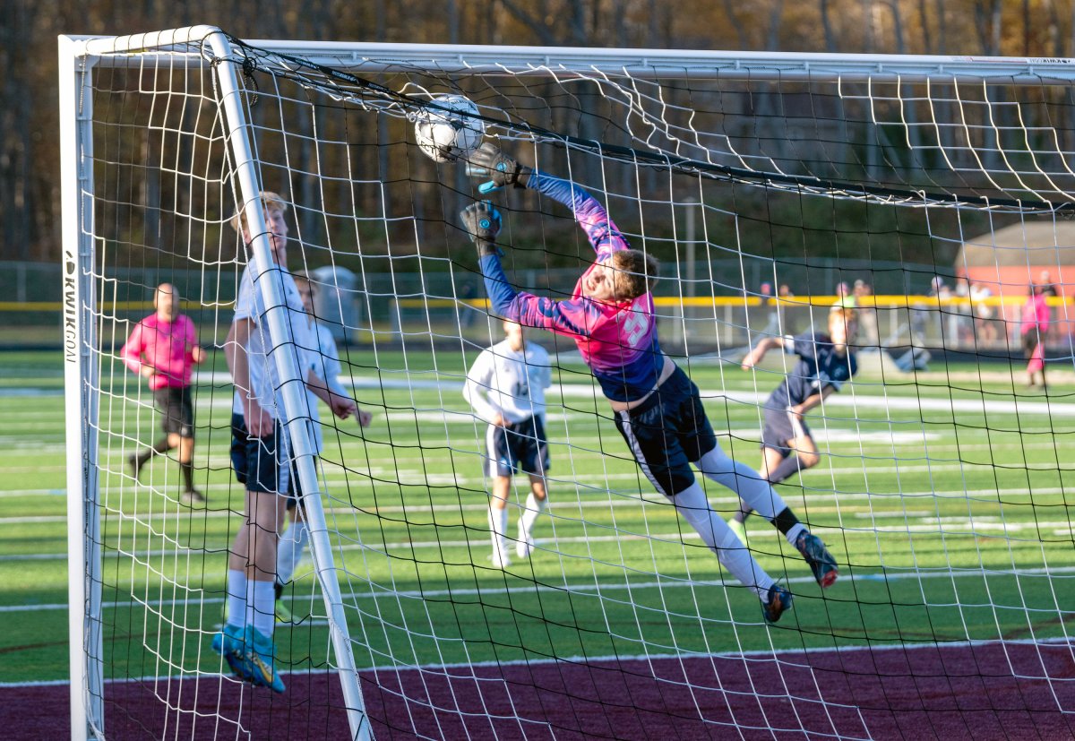 Oceanside goalie Grady Geretz tries to stop a shot during the second half of the Class B boys soccer final against Yarmouth High School in Auburn. The photo earned a top-10 honor in the sports action shot category at the annual Associated Press Sports Editors Association awards. (Daryn Slover/Staff Photographer)