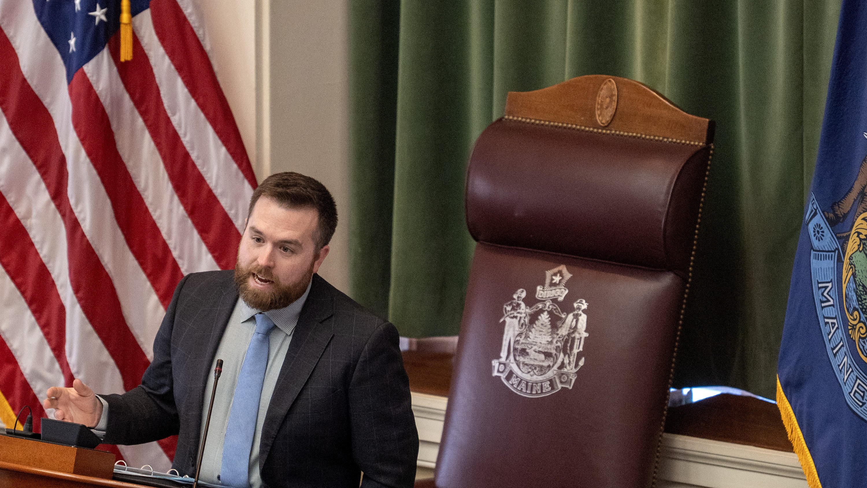 Purchase this imageSpeaker of the House Ryan Fecteau, D-Biddeford, speaks during a debate Tuesday in House chamber of the Maine State House in Augusta. (Joe Phelan/Staff Photographer)