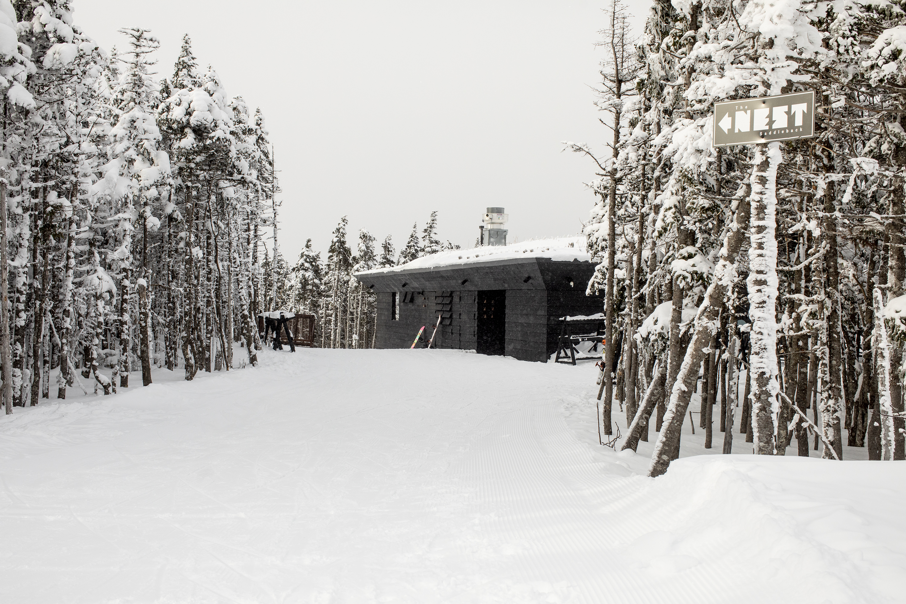 Perched at an elevation of 3,620 feet and tucked into a mini forest of dwarfed spruce trees at Saddleback Mountain, an architectural delight known as The Nest rises from the snow.