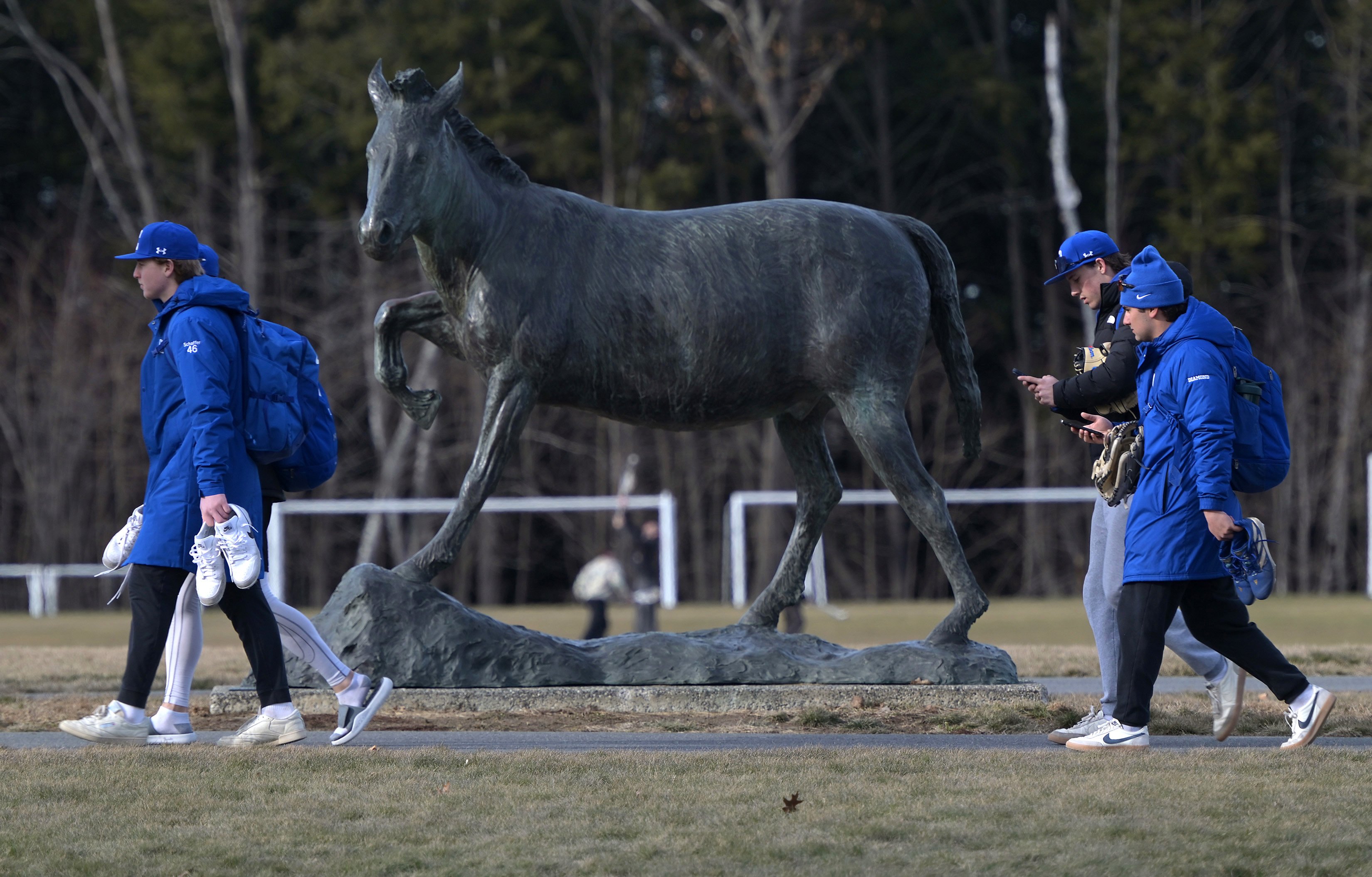 Colby College’s baseball team members pass the sculpture ‘The Colby White Mule’ by Forest Hart at the college Wednesday in Waterville. The players were crossing campus after leaving the baseball park. The next home game is scheduled for 4 p.m. March 31 against Plymouth State University, according to the college’s website. (Rich Abrahamson/Staff Photographer)