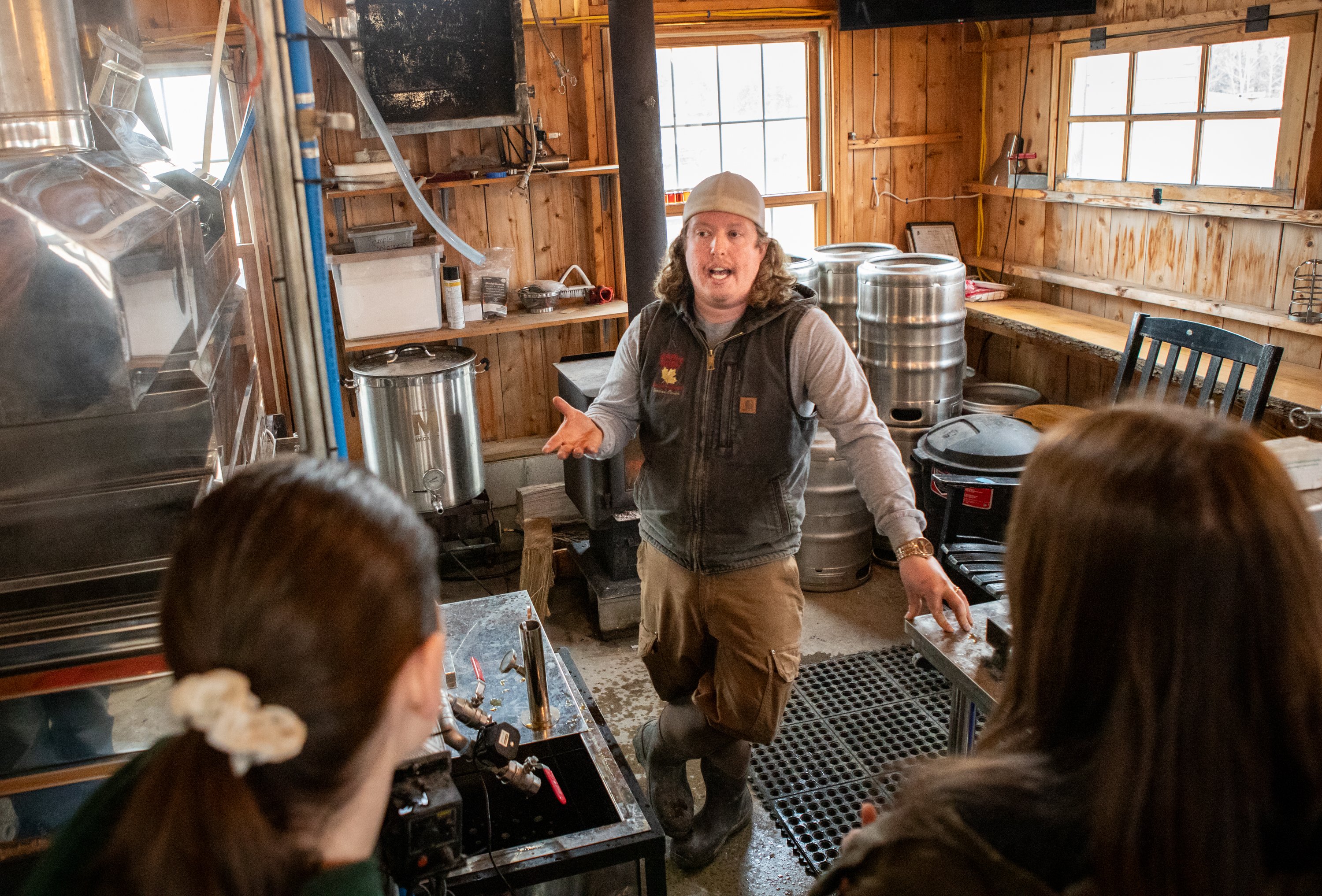 Purchase this imageMaple Rush Sugar House owner and sugar maker Jordan Davis of Sabattus answers questions from visitors Saturday, March 21, about the syrup making process during Maine Maple Sunday Weekend. (Libby Kamrowski Kenny/Staff Photographer)