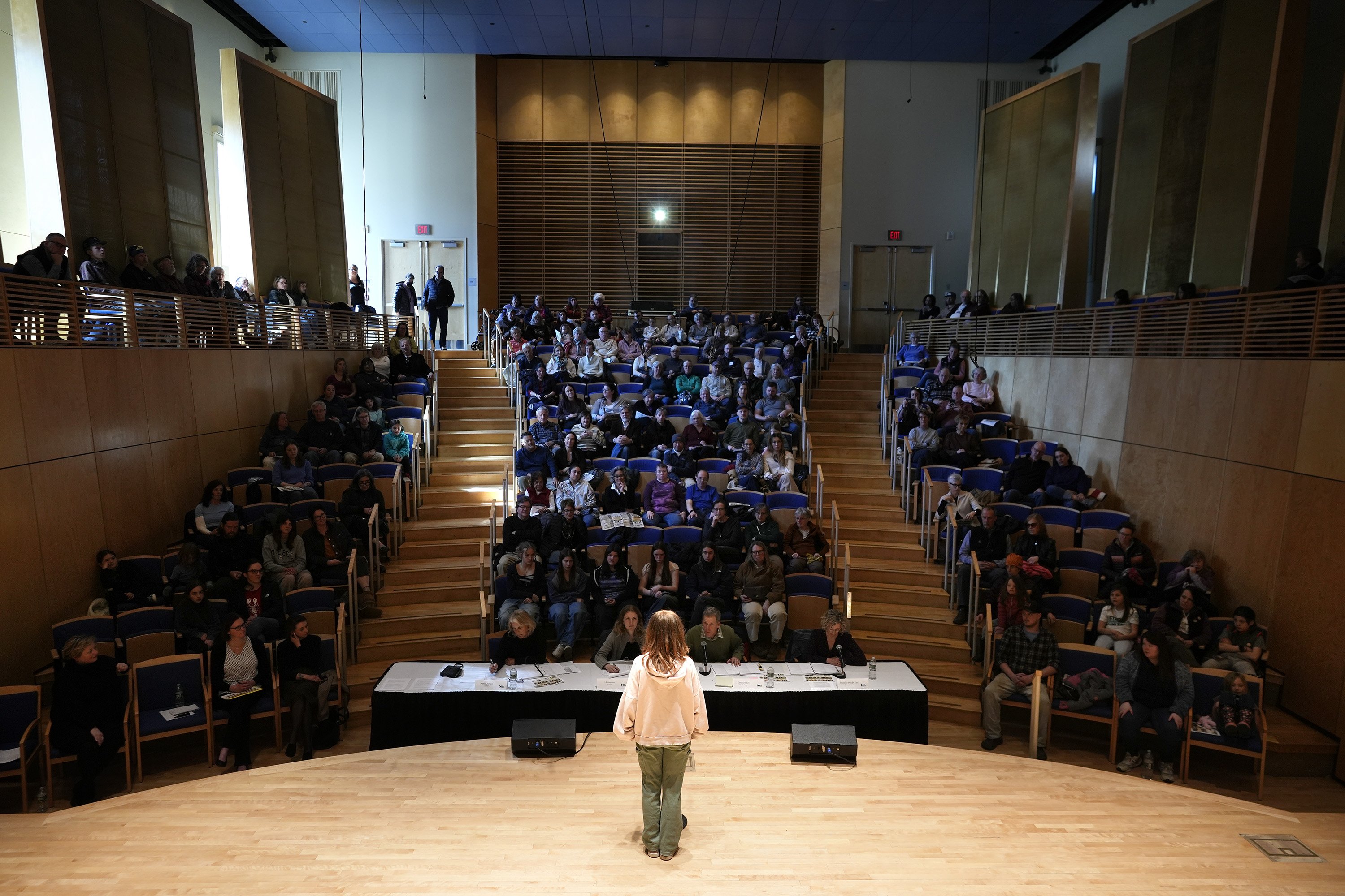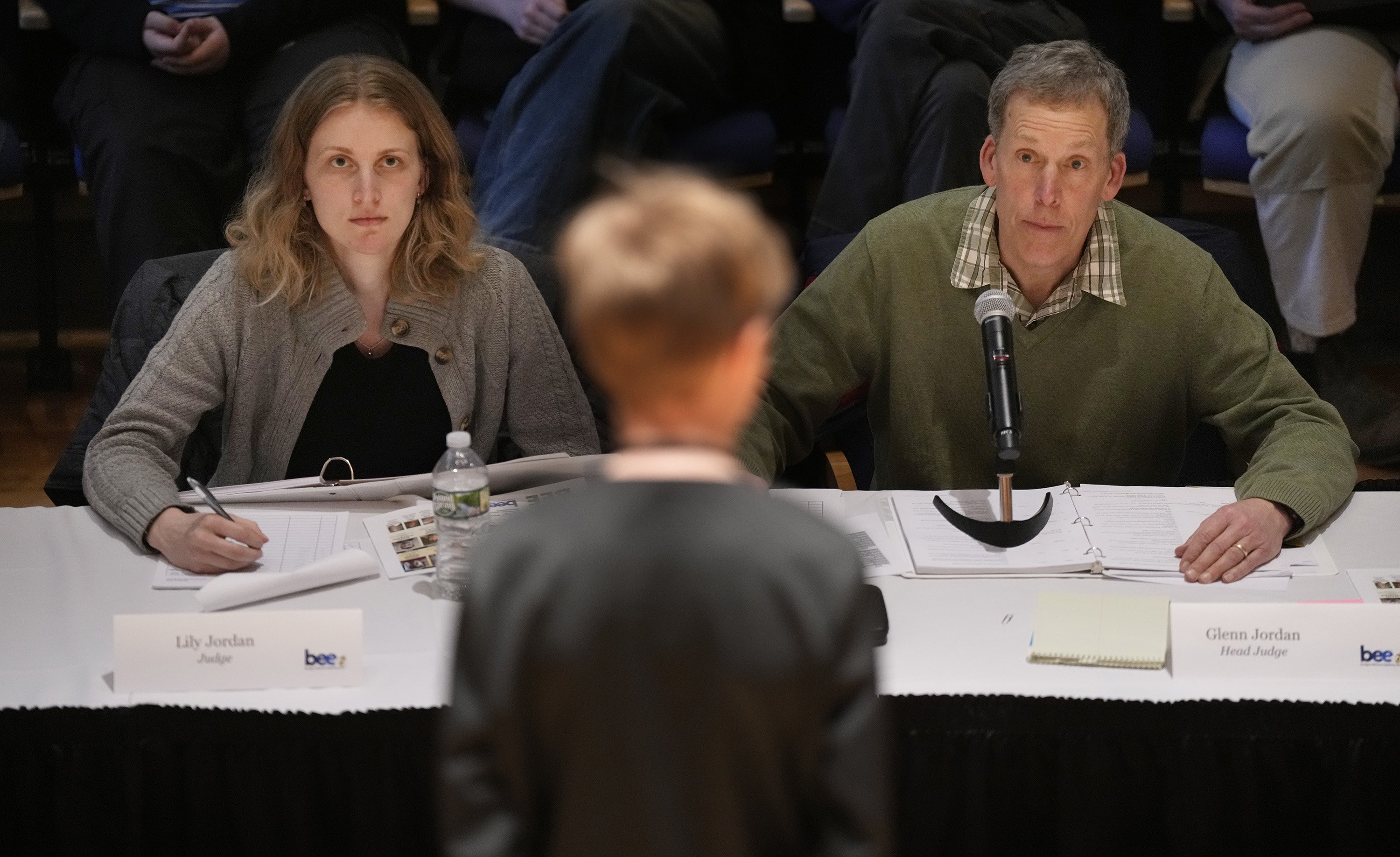 Lily Jordan, of San Francisco, returned to her home state to judge this year’s bee after winning it twice as a middle schooler. Her dad, Glenn Jordan, a retired Press Herald sports writer, and her mom, Nancy Jordan, the lead content developer at National Geographic Learning, were also at the judges’ table. Meanwhile, their dog, Webster — like the dictionary — took a nap under the table.