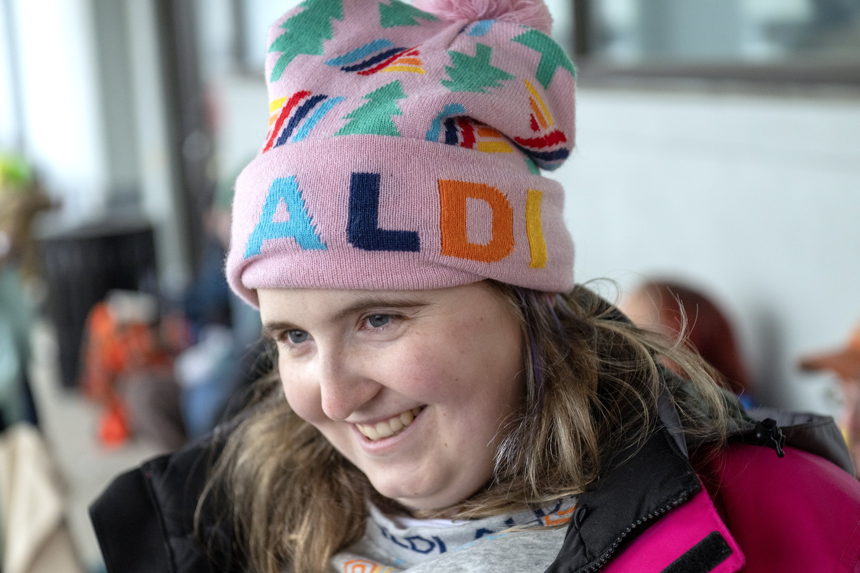 Kay Kerina, 33, of Portland, proudly showed off her coordinated Aldi fleece onesie and jacket. “Check the fit,” she said, smiling and posing for onlookers.