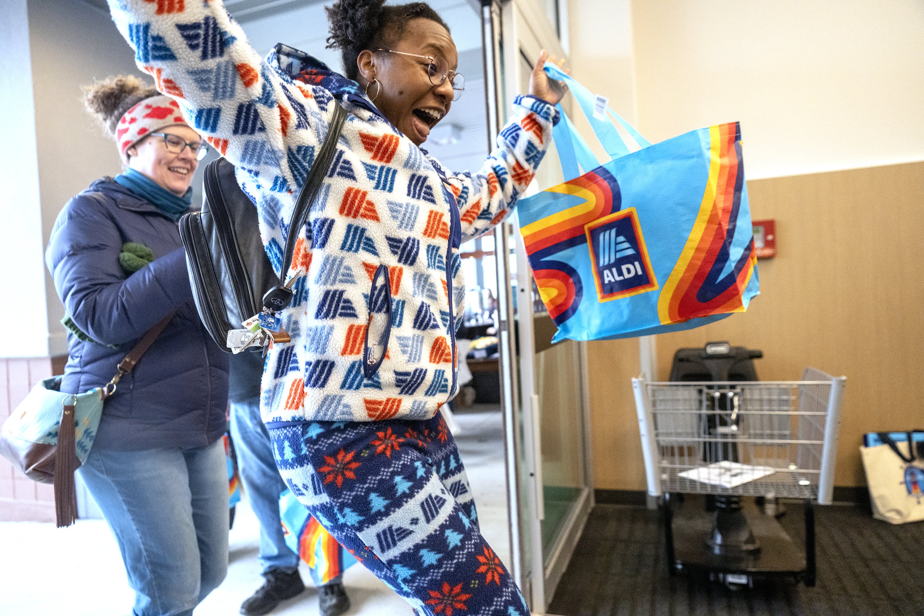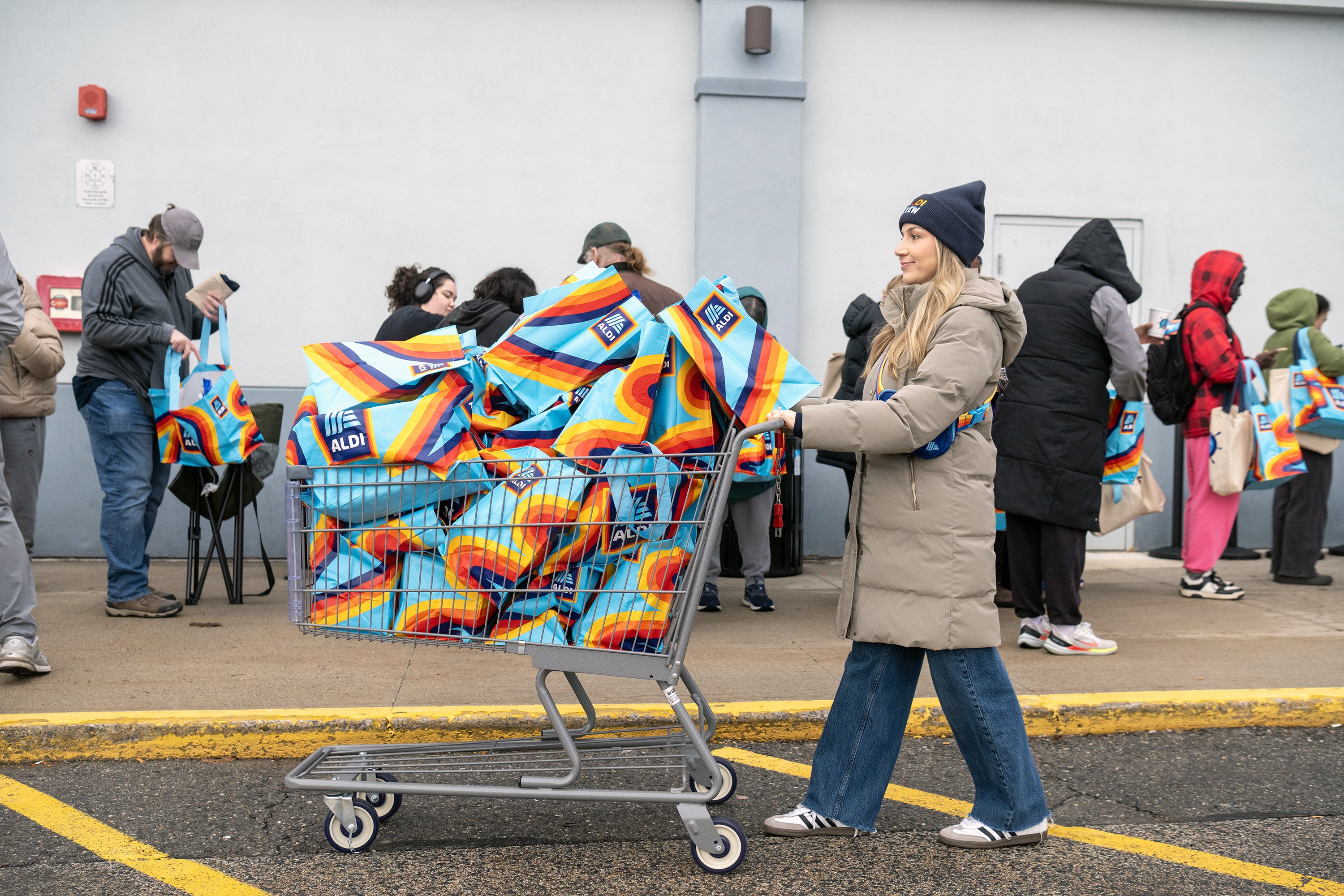 “We knew it would be like this, and you gotta get the swag,” said Ronda Piotrowski, 68, holding a canvas Aldi bag that contained an Aldi mug.