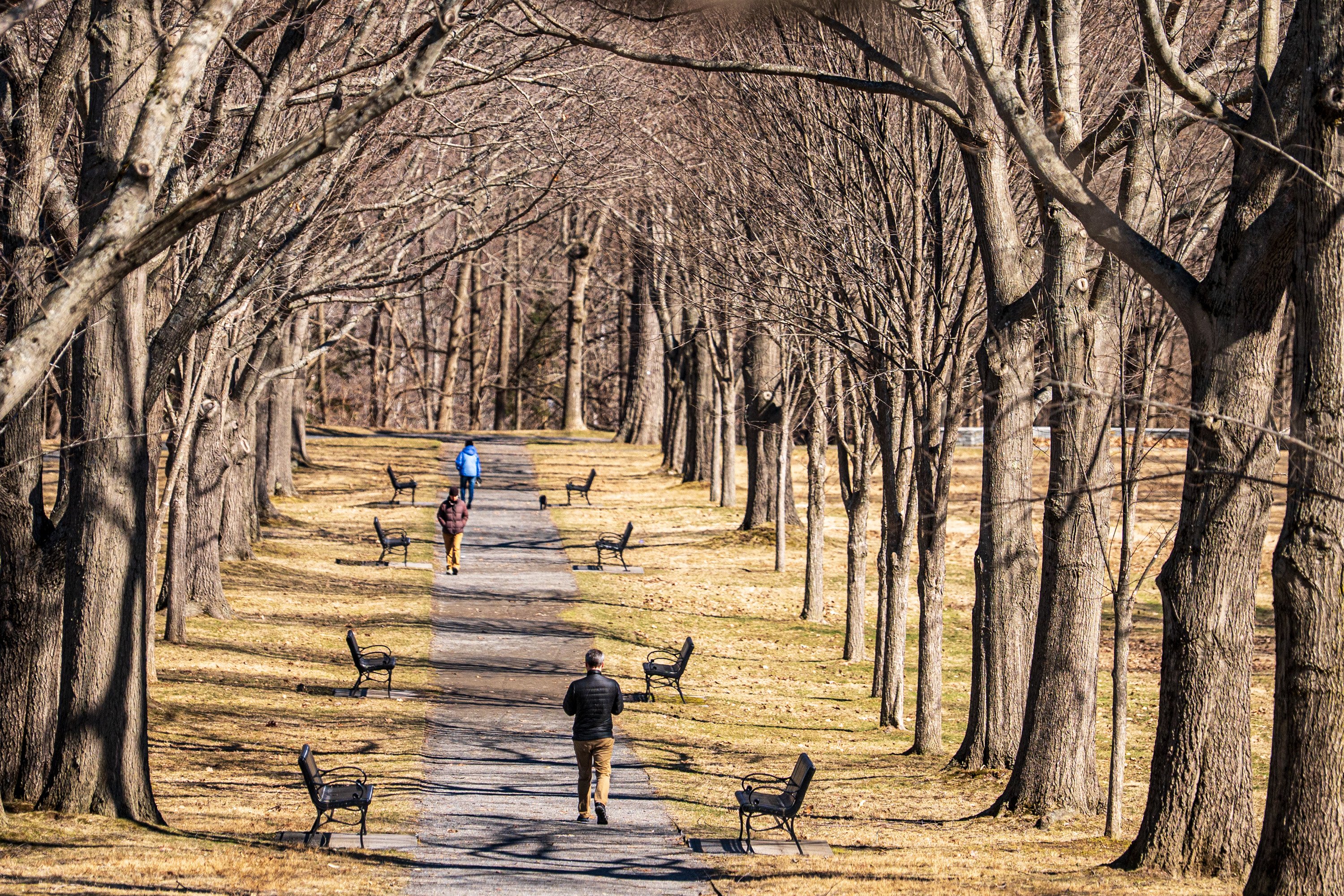 People walk along an allée of trees Wednesday in Capital Park in Augusta. (Joe Phelan/Staff Photographer) Purchase this image