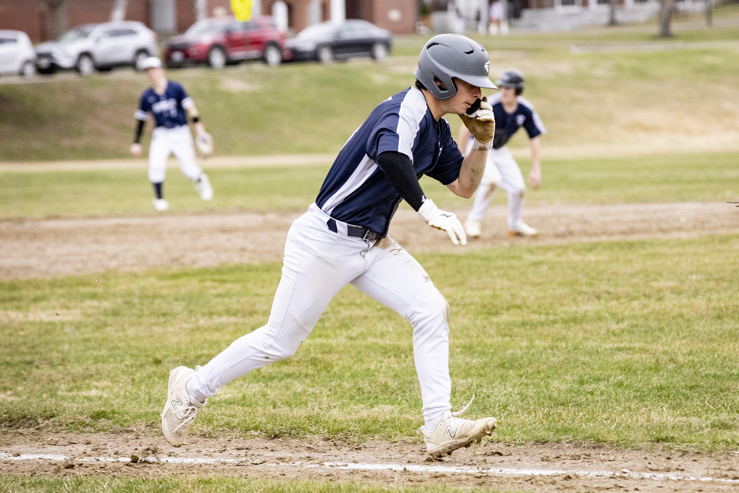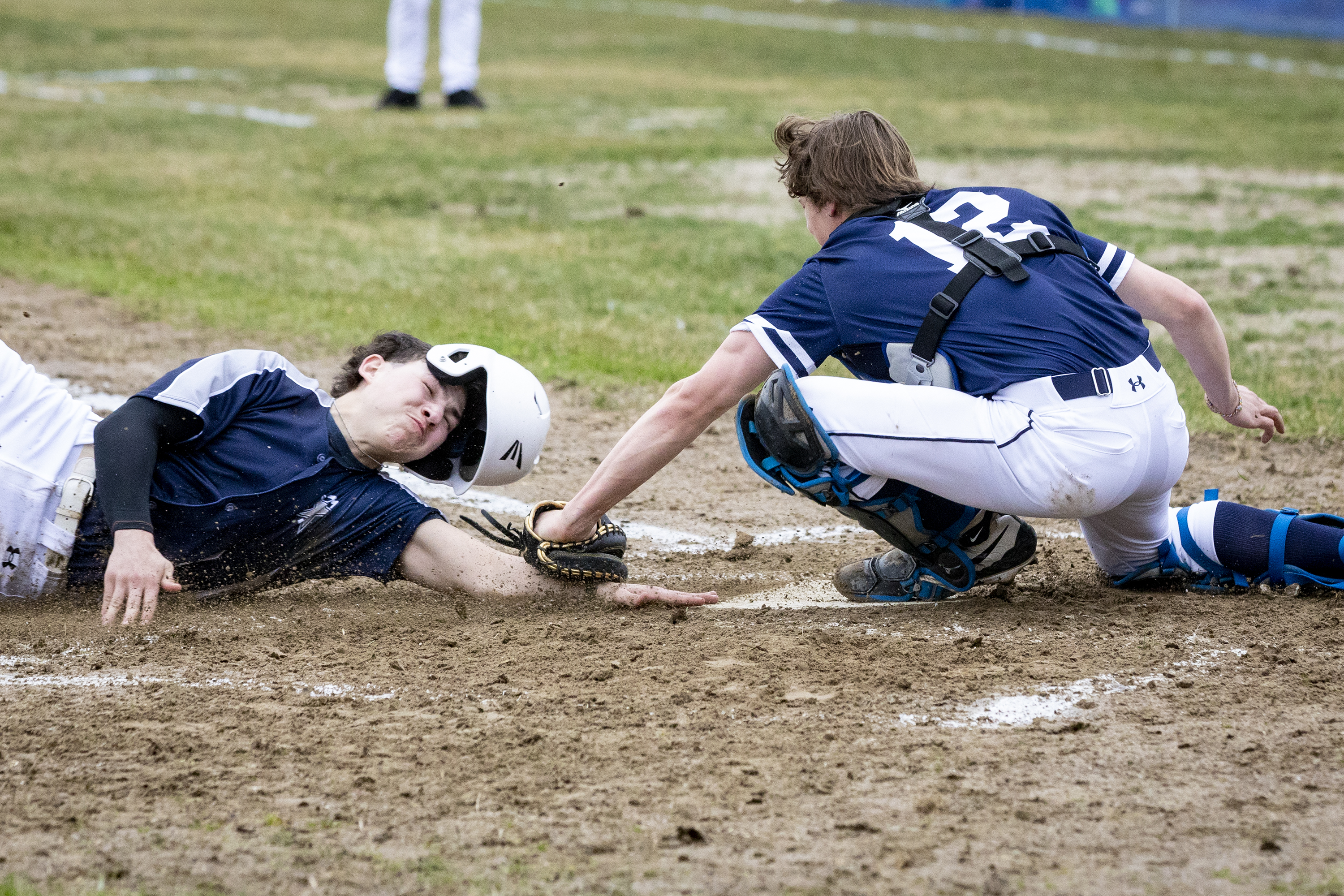 Gould Academy’s Richard Bidner tags out Telstar’s Brennan Walker during a scrimmage April 15. (Rose Lincoln/Staff Writer)
