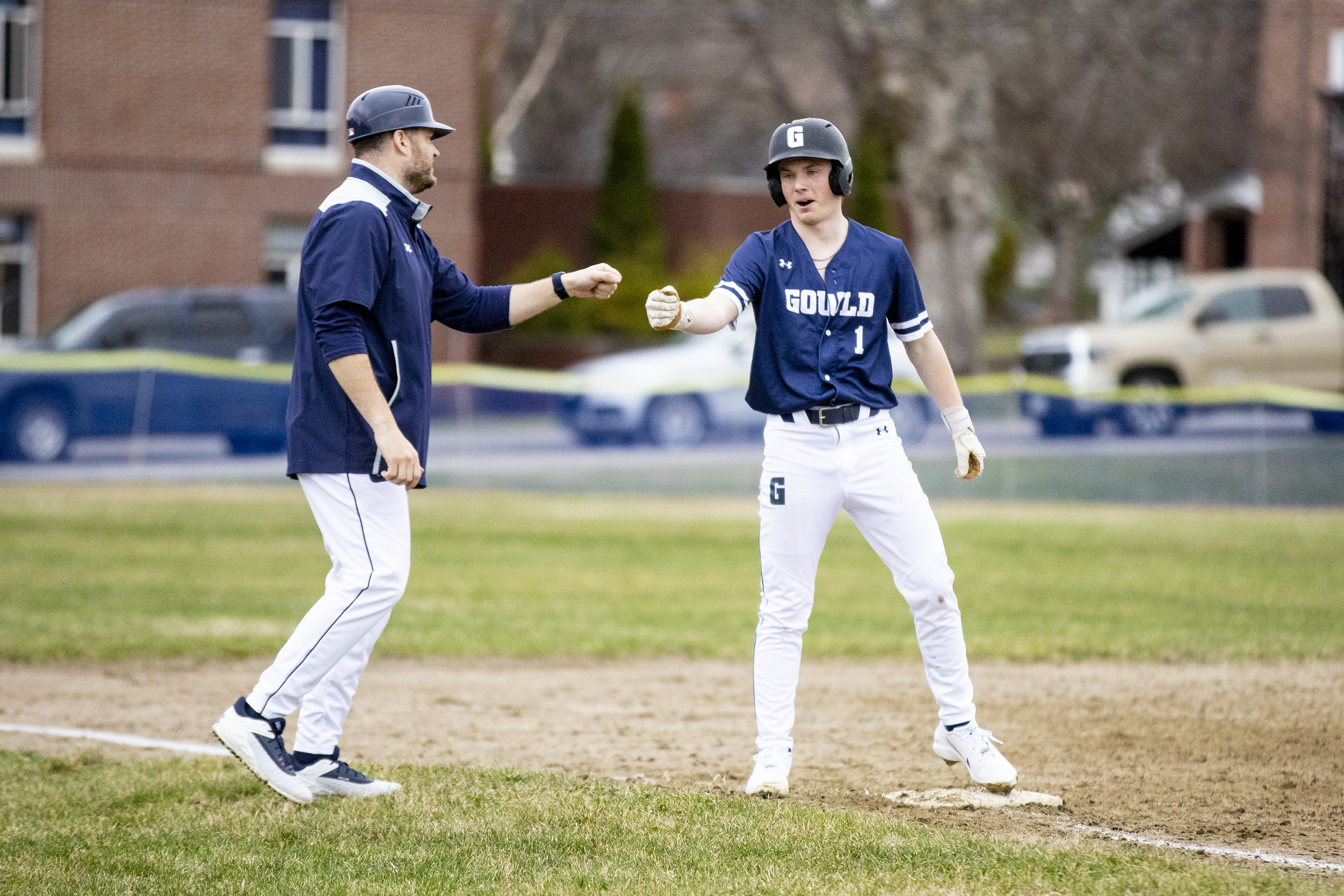 Telstar baseball coach Josh Mowery congratulates Gould Academy’s Jasper Wills for a play he made April 15 at third base. (Rose Lincoln/Staff Writer)