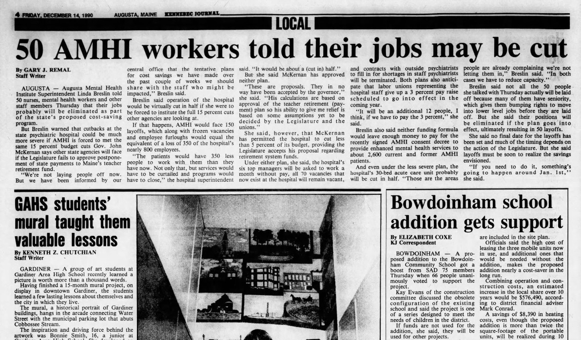 Dec. 14, 1990: 50 Augusta Mental Health Institute told their jobs may be cut, Bowdoinham school addition get addition, and Waterville officials still interested in shopping mall
