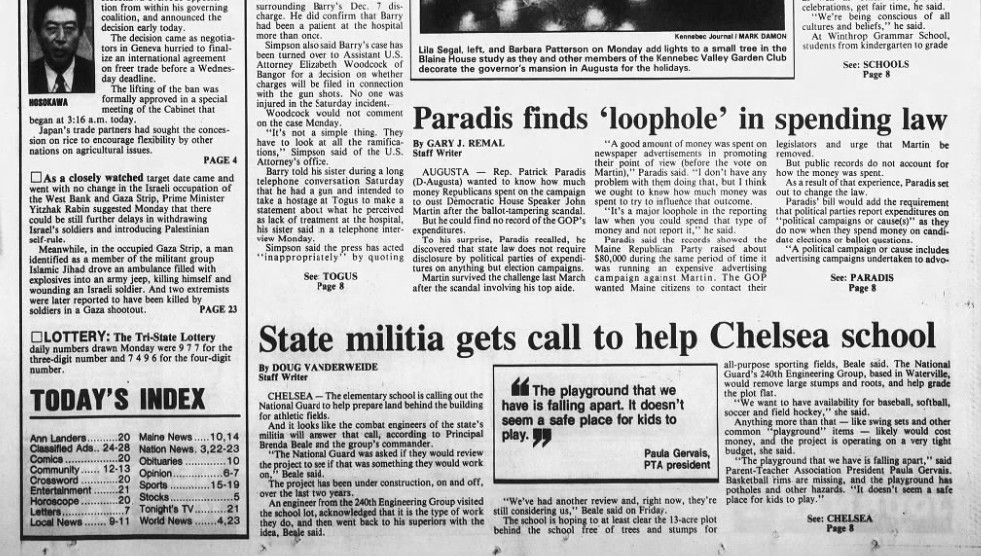 Dec. 15, 1993: Chelsea Elementary School calls on National Guard to help with land for athletic fields, state representative finds loophole in law, and the Blaine House gets a little brighter