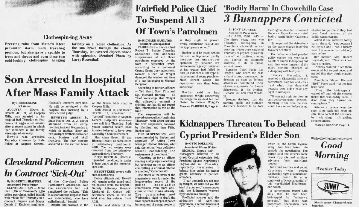 Dec. 16, 1977: Fairfield police chief suspends all but 3 of town’s patrolmen, son arrested in Augusta hospital after mass family attack, and clothespin-ing away