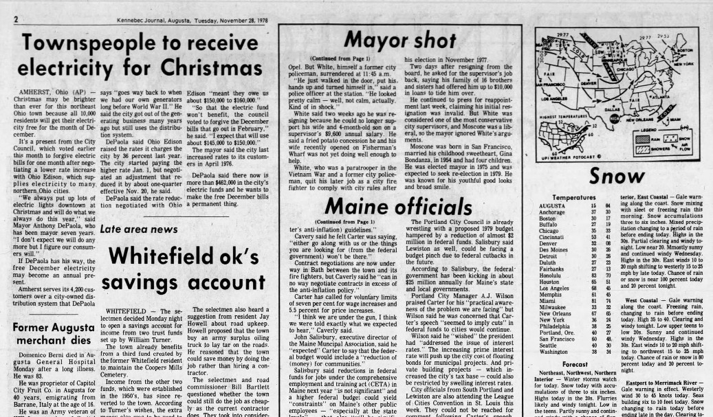 Nov. 28, 1978: Former proprietor of Capitol City Fruit Co. in Augusta for last 40 years has died, town of Whitefield allows new savings account, and Ohio townspeople will have a brighter Christmas, literally.