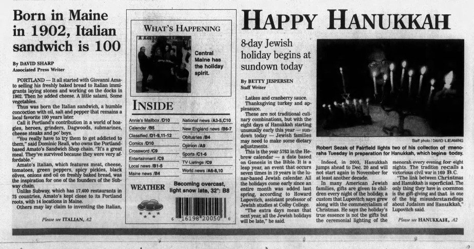 Nov. 29, 2002: Born in Maine in 1902, Italian sandwich turns the big 100, Maine Central Institute coach opens up his home for Thanksgiving, and Hanukkah beings at sundown today