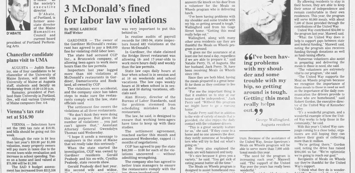 Nov. 30, 1995: Owner of McDonald’s in Gardiner, Rockland, and Damariscotta fined for labor law violations, plans continue for Hallowell-area school child care program, and the importance of Meals on Wheels for those housebound