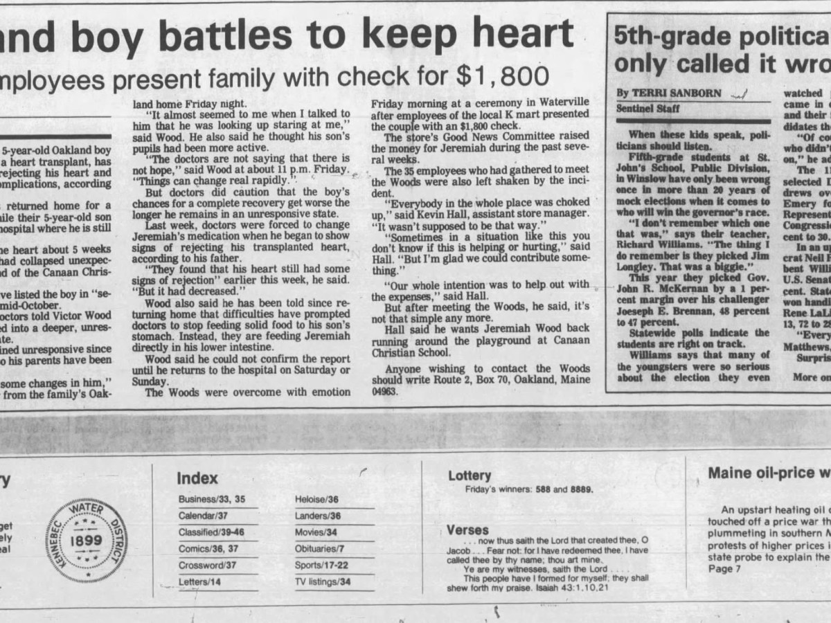 Nov. 3, 1990: Kmart employees in Waterville present Oakland family check to help toward’s boy’s new heart, Mid-Maine Medical Center president resigns, and these Maine 5th grade political pundits only called it wrong once