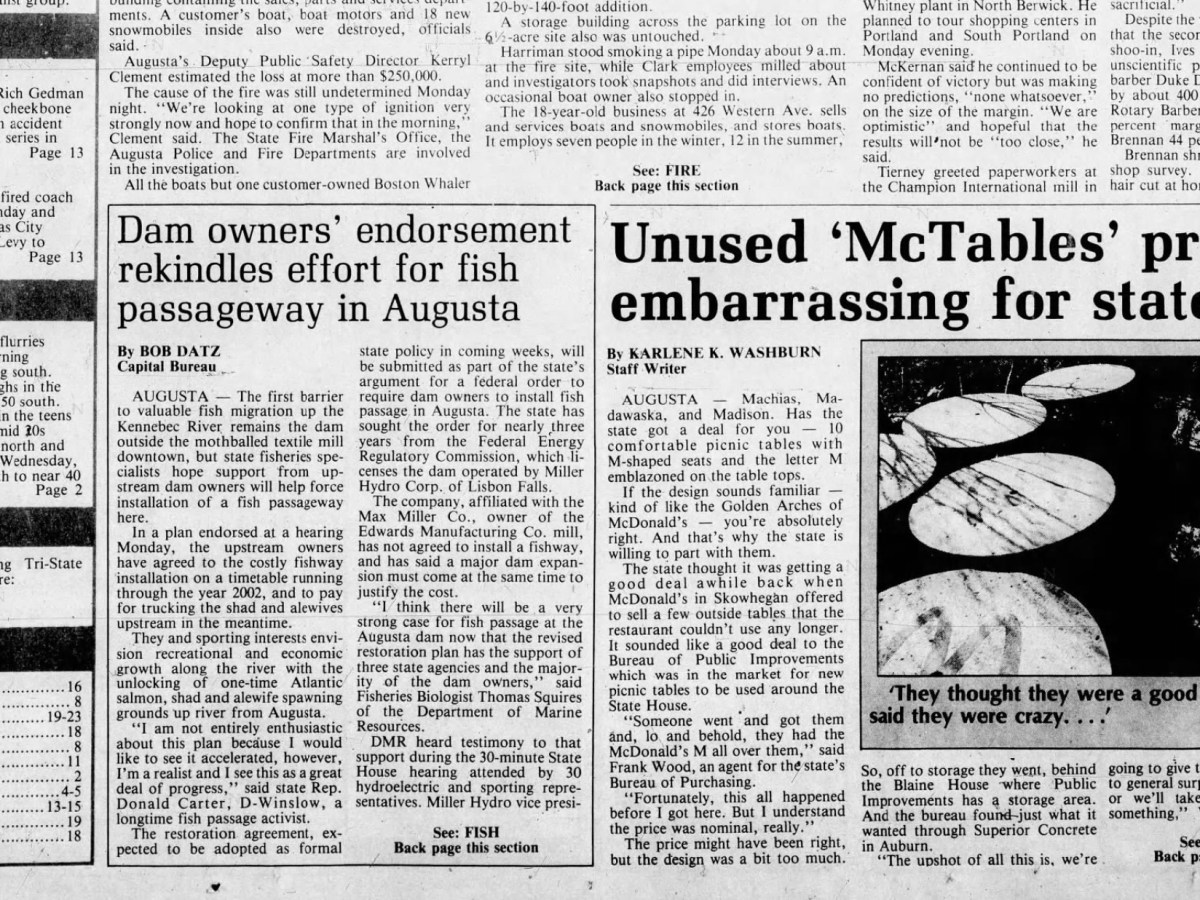 Nov. 4, 1986: Unused McDonald’s picnic tables from Skowhegan prove to be embarrassing for state, fire damages outer Western Avenue business in Augusta, and dam owner’s endorsement rekindles effort for Augusta fish passageway