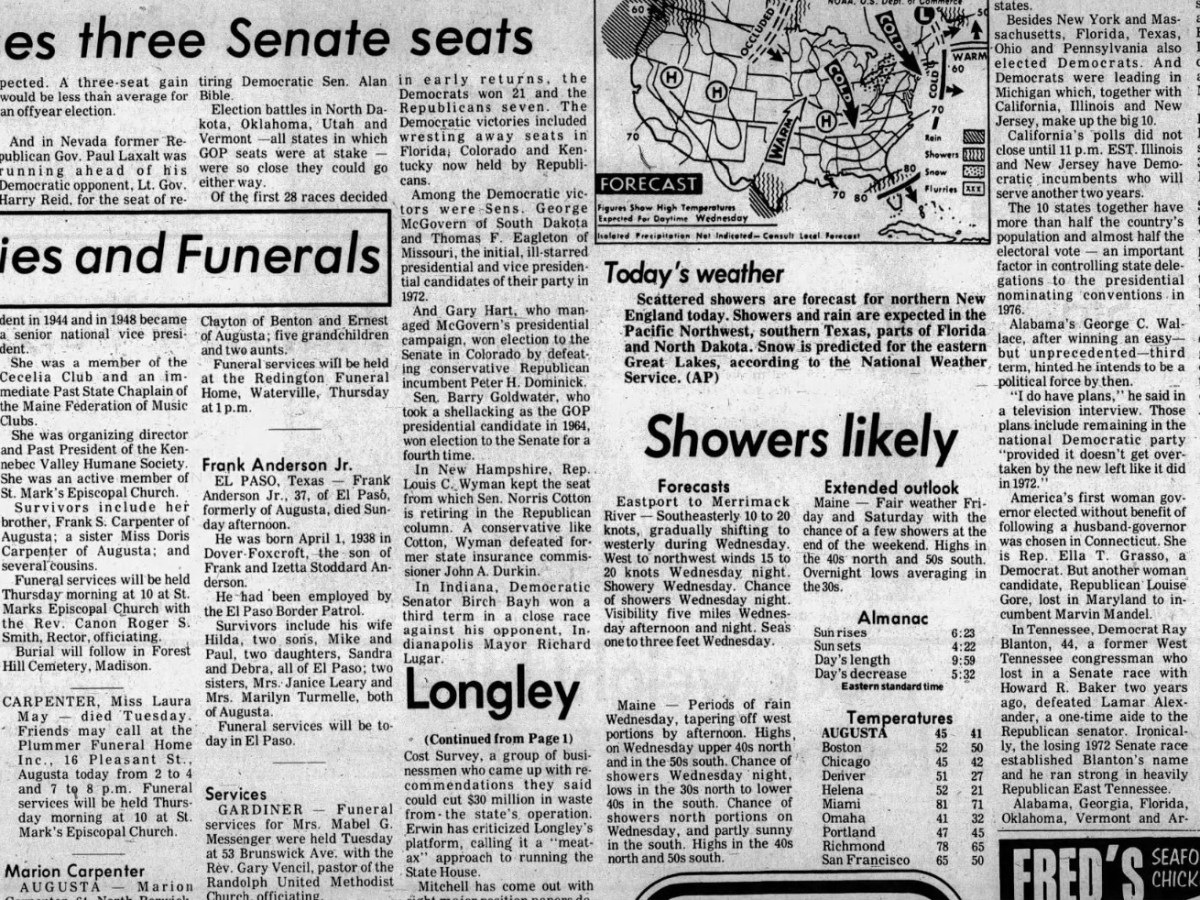 Nov. 6, 1974: Prominent woman from Augusta dies at Gardiner nursing home, GOP loses three Senate seats, and two hurt in Augusta crash last night