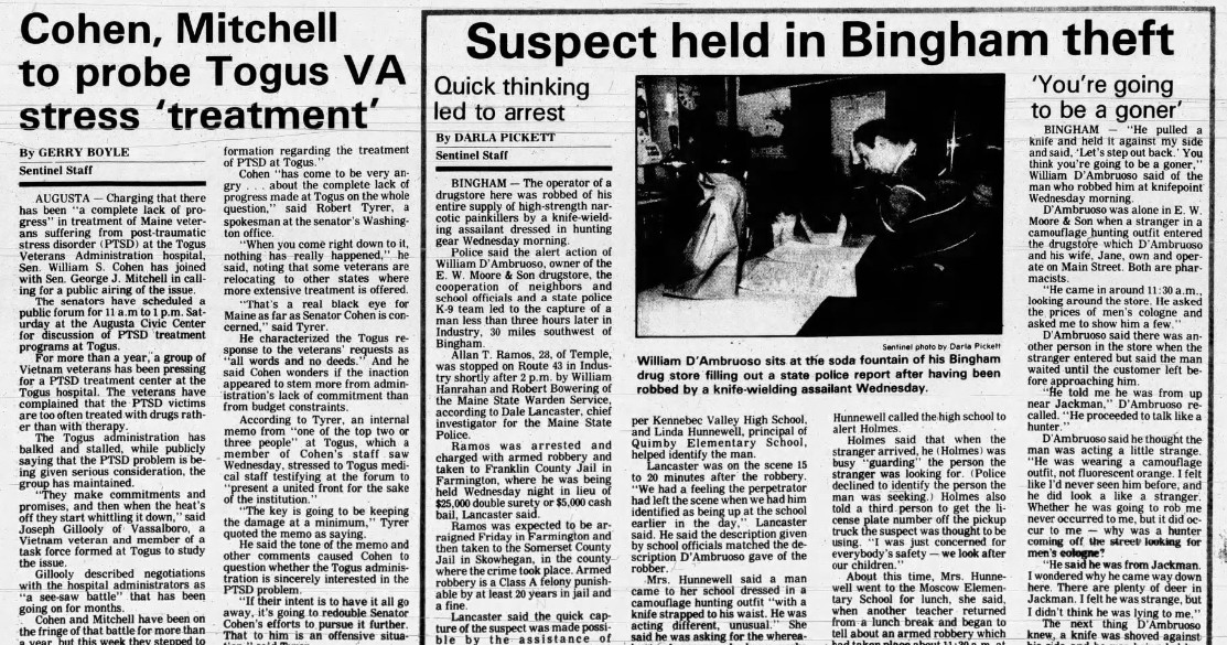 Nov. 1, 1995: Manhunt continues for armed Randolph man who fled into woods near Pleasant Ridge Plantation, former Waterville mayor will be sentenced on embezzlement charges, and a Waterville woman was arrested for allegedly taking money from rundown parlor on Main Street