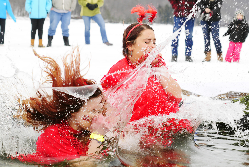 Dozens of people jumped into Maranacook Lake on Saturday through a hole carved in the ice.