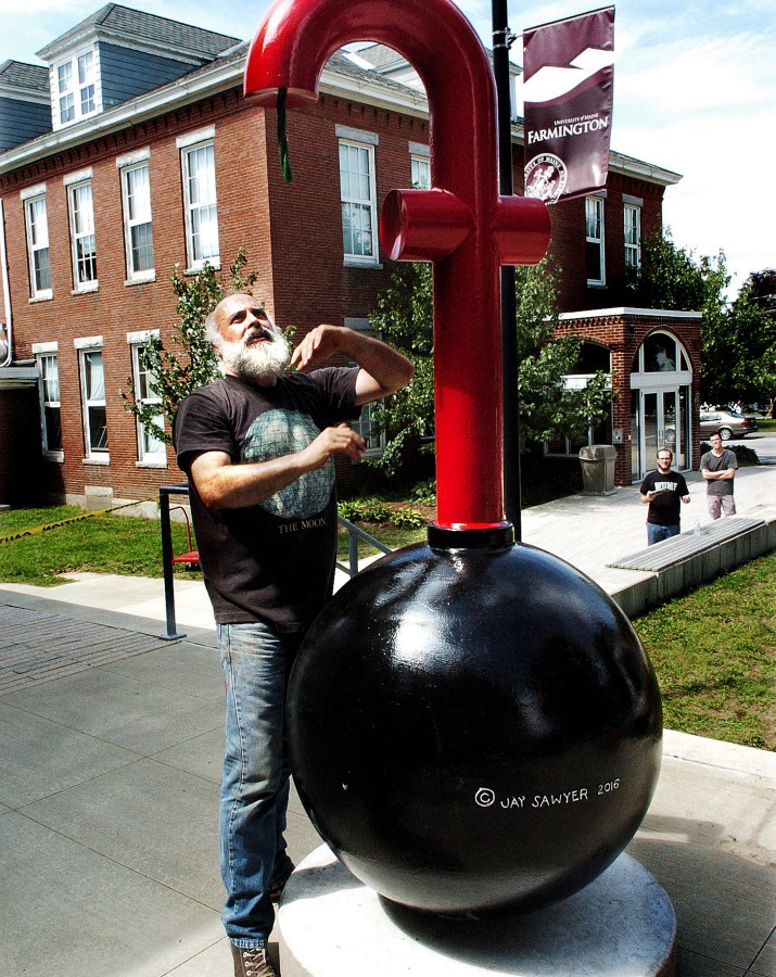 Sculptor Jay Sawyer’s exhibit, ‘Sculpture Soup,’ the opening exhibit of the academic year at the Emery Community Arts Center in Farmington, uses repurposed materials, the alphabet and a lot of wit.