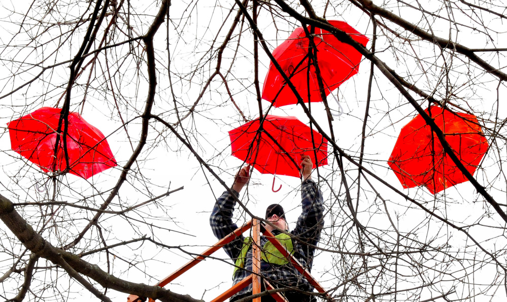 Umbrellas fill tree in Waterville’s Castonguay Square