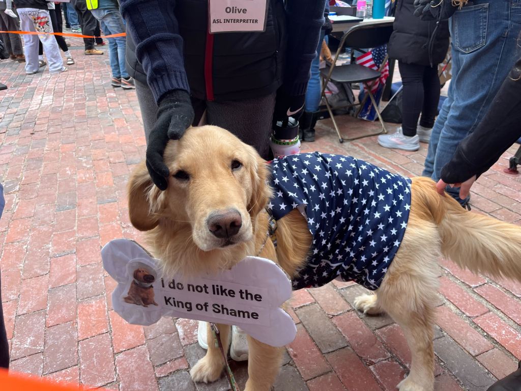 Pets also came in costume. Bailey, a 3-year-old golden retriever, attended Saturday’s “No Kings” protest in Portland with his owner, Sarah Kinney, of Portland.