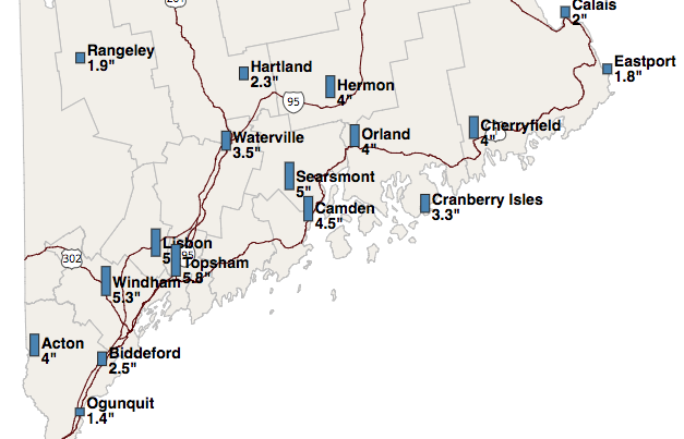 Many towns received more accumulation than expected with Topsham coming in at a statewide high of 5.8 inches, according to National Weather Service reports. The map below illustrates reported snowfall accumulations from National Weather Service observers as of 8:50 a.m. Tuesday. INTERACTIVE: Christian MilNeil | @c_milneil
