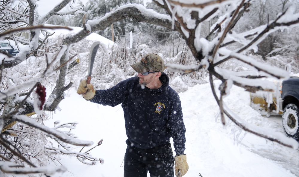 Kevin Lemar climbs over a pile of hemlock Thursday that he cut and delivered to a customer in Randolph. The Belfast logger used a scale ruler to measure the logs, which will be used for a construction project.