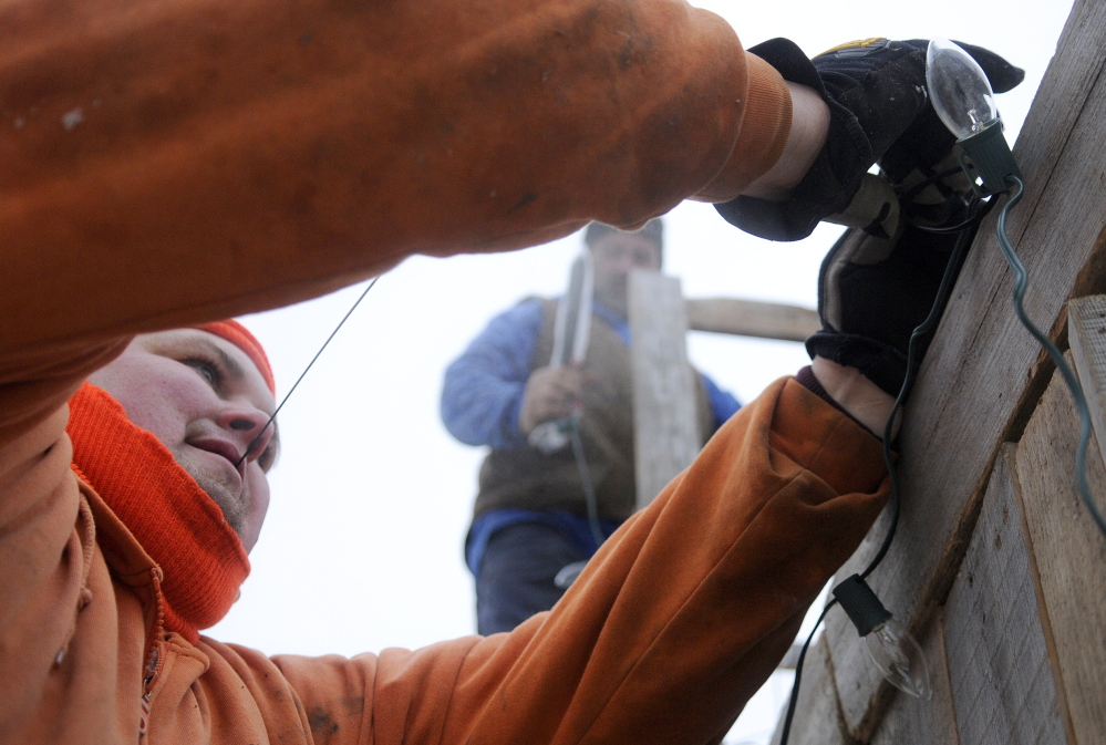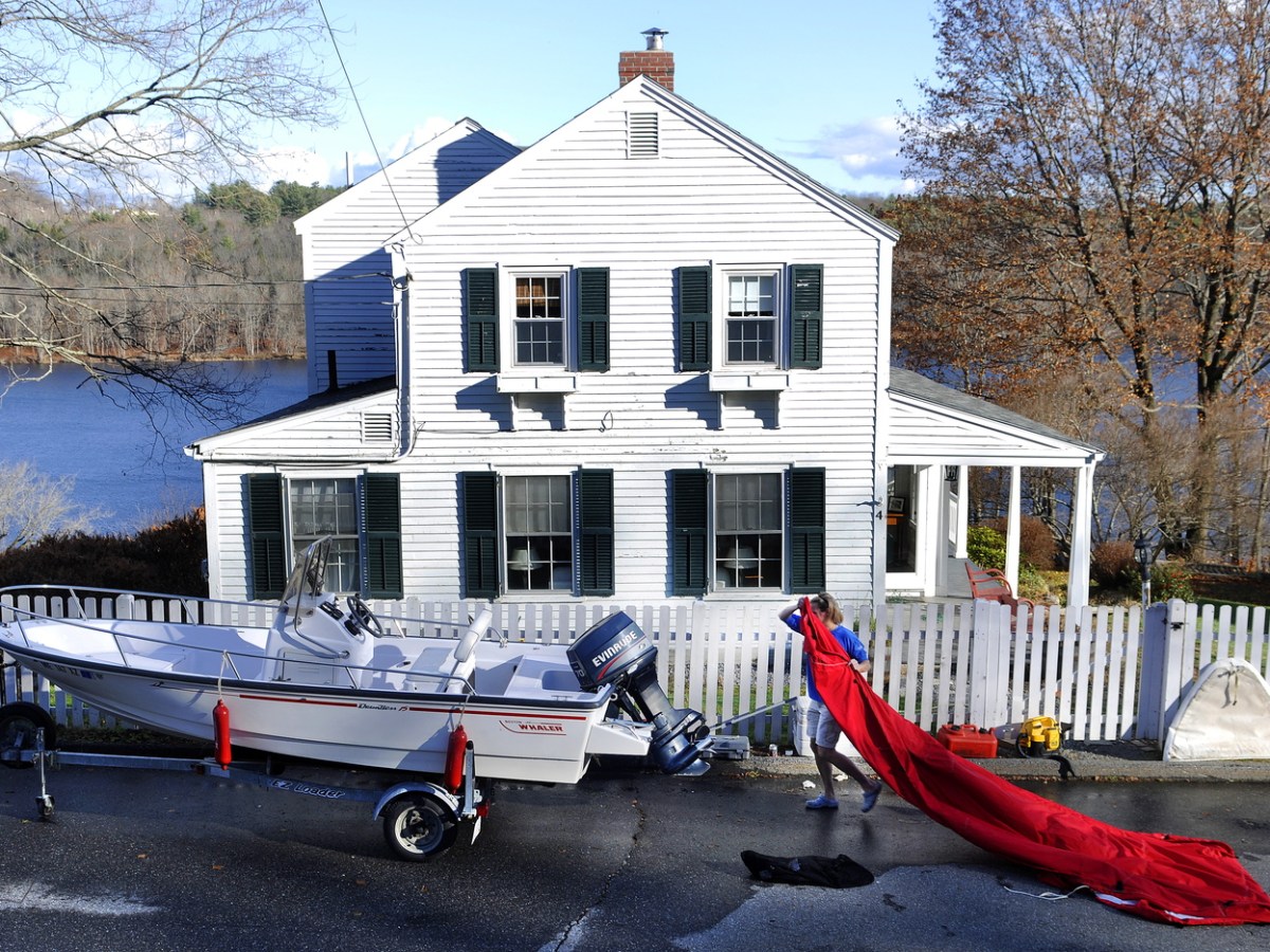 Jen Holsten places the cover over her boat Monday in Hallowell.